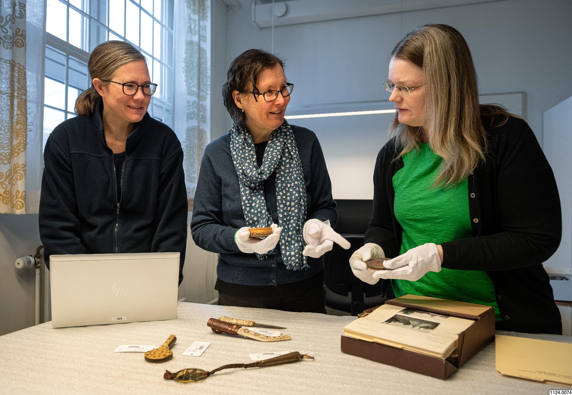 - Etnolog Sunna Kuoljok från Ájtte, Svenskt Fjäll- och Samemuseum, studerar samiska föremål på Etnografiska museet.