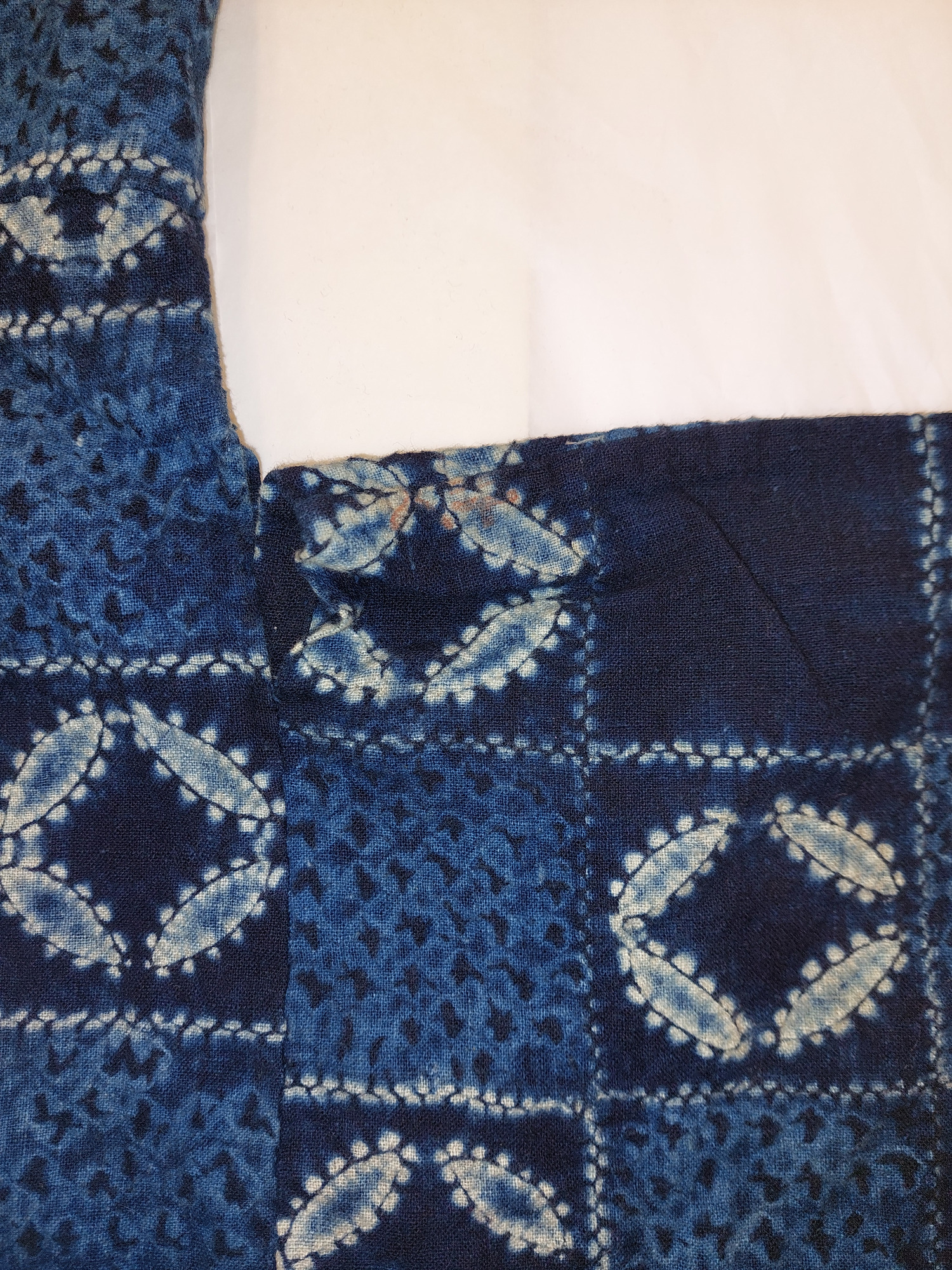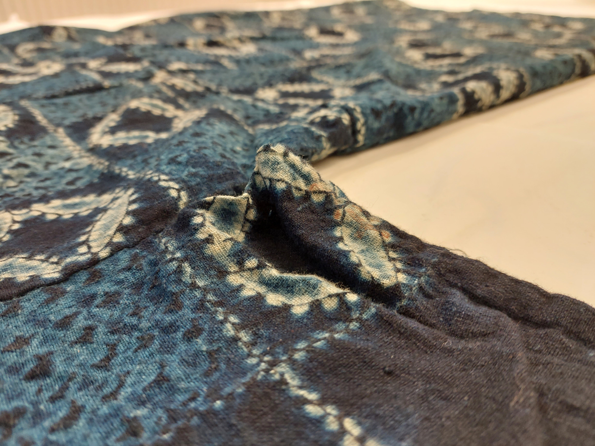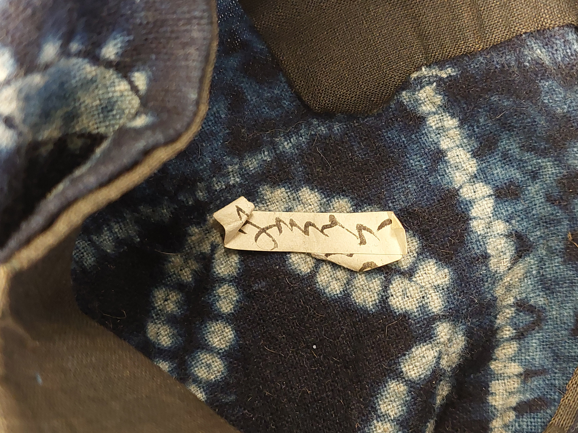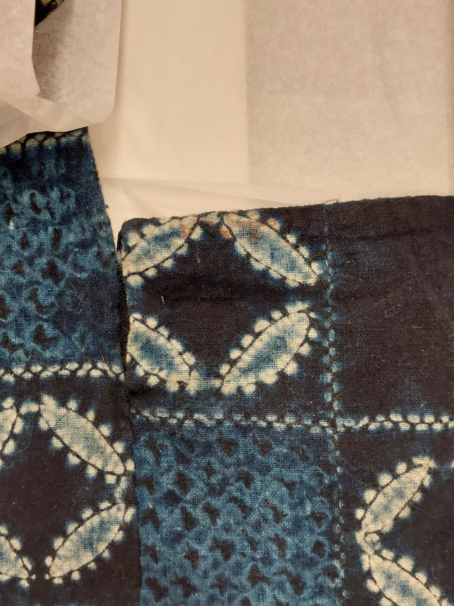 Kimono av indigofärgat bomullstyg, shibori-mönstrat (sydd och knuten shibori). Mönster av cirklar ("shippo") och rutor.
