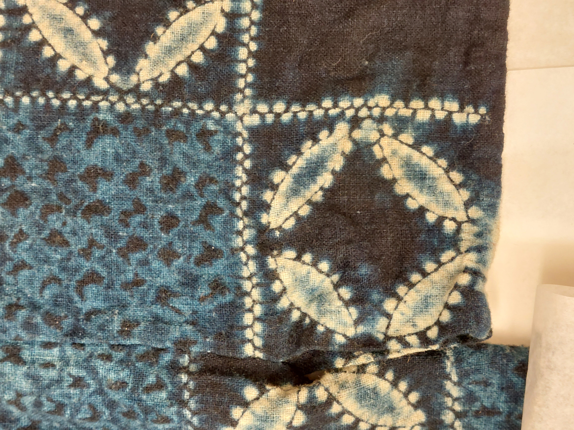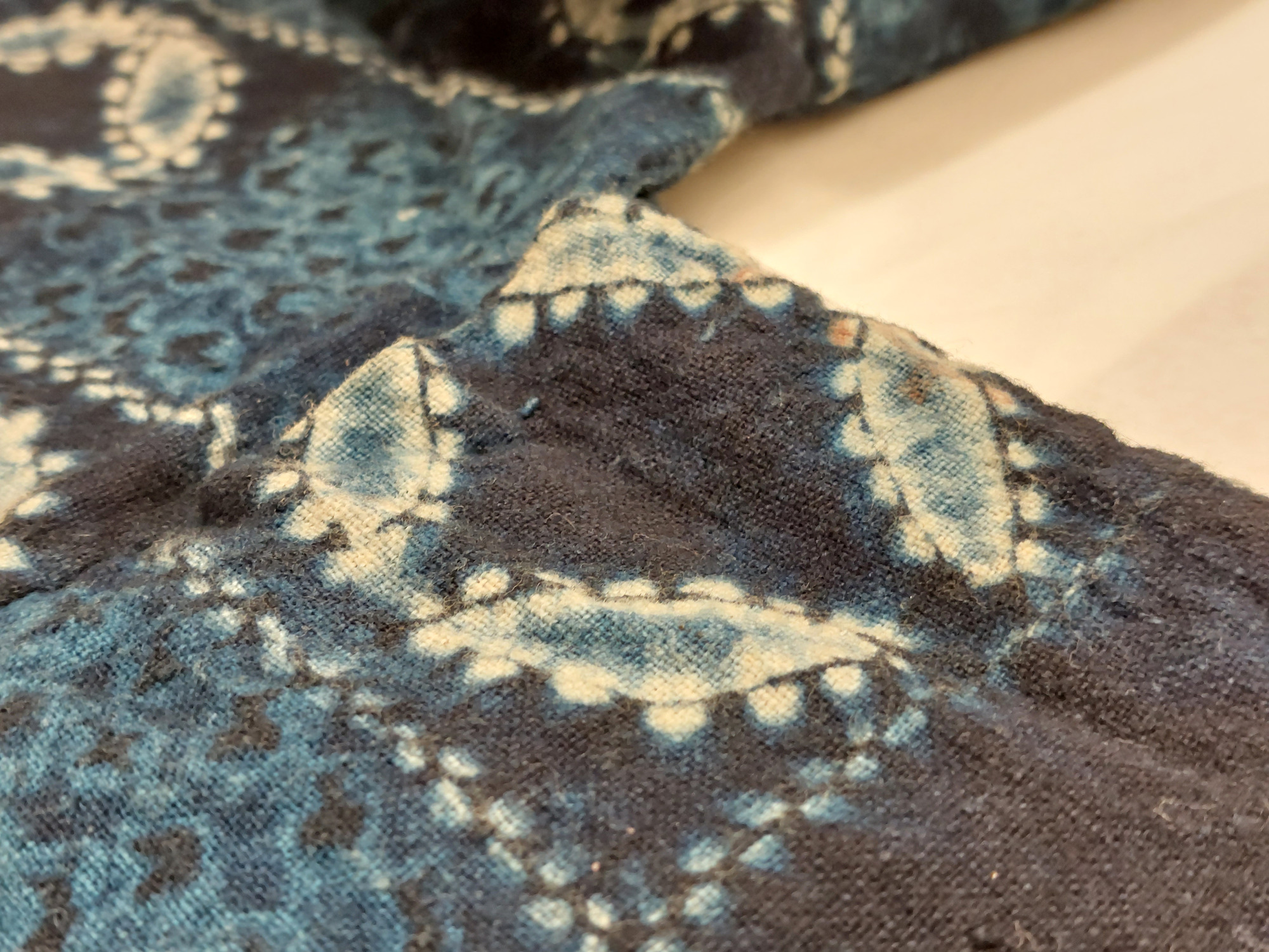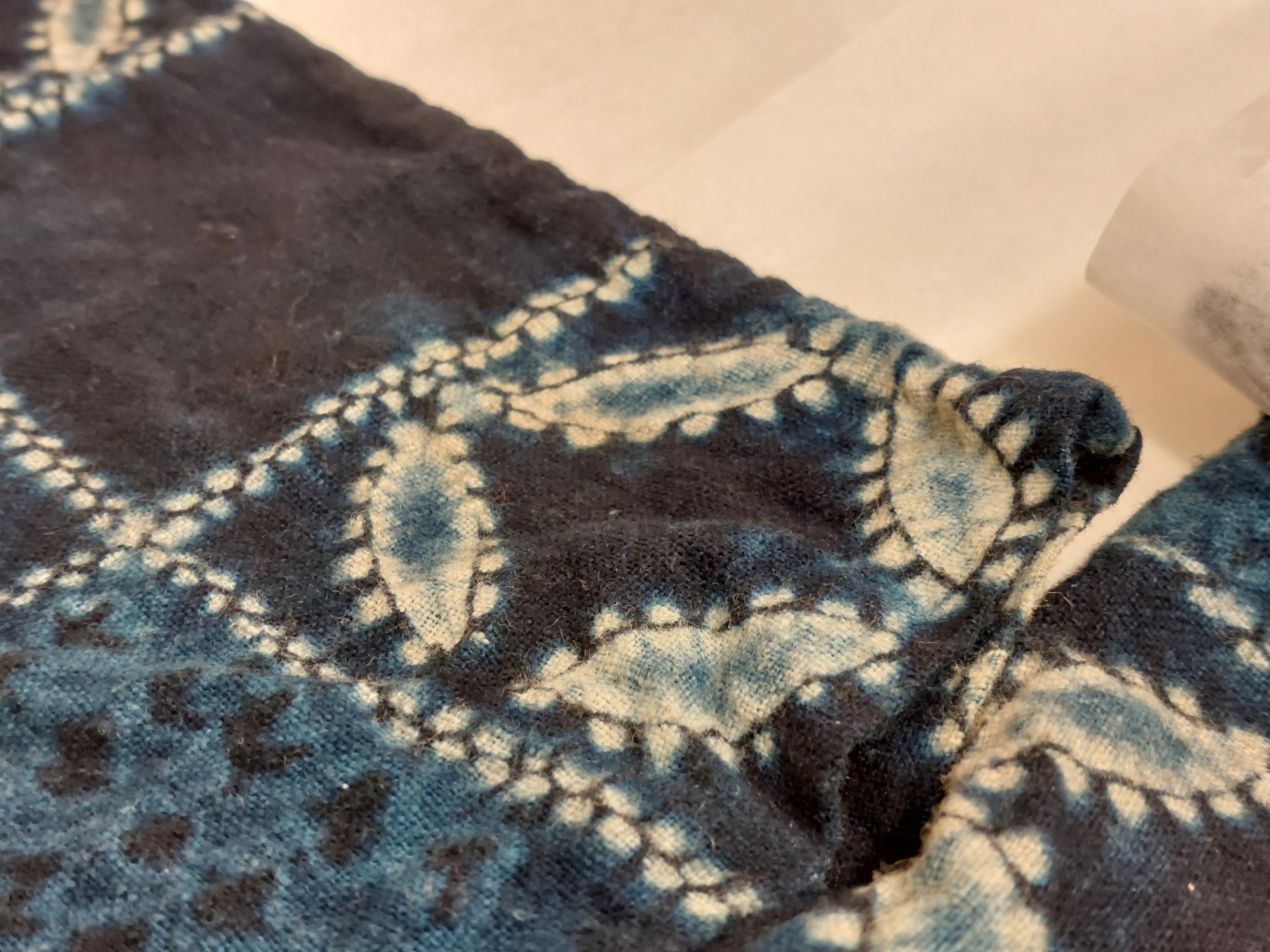 Kimono av indigofärgat bomullstyg, shibori-mönstrat (sydd och knuten shibori). Mönster av cirklar ("shippo") och rutor.