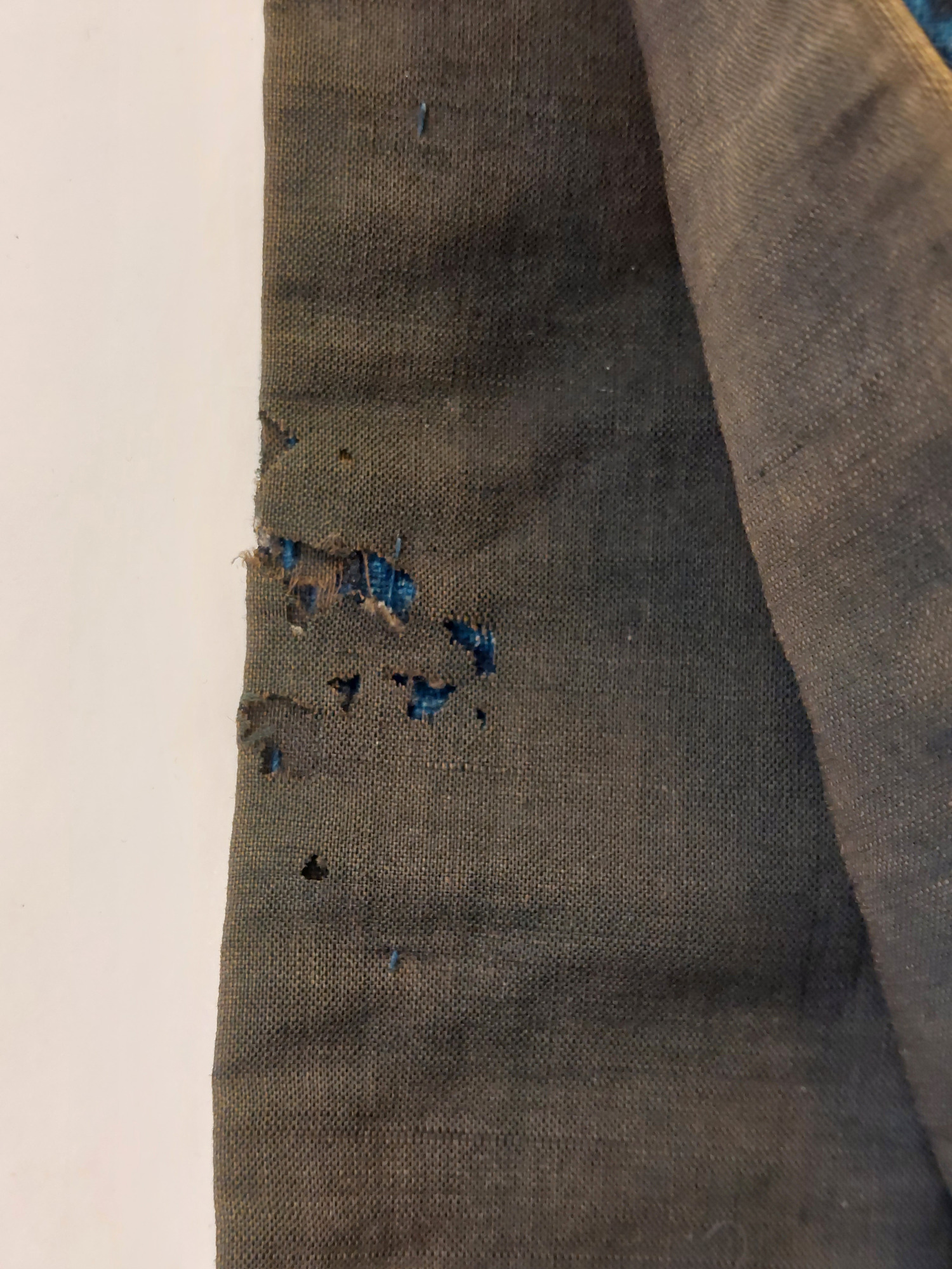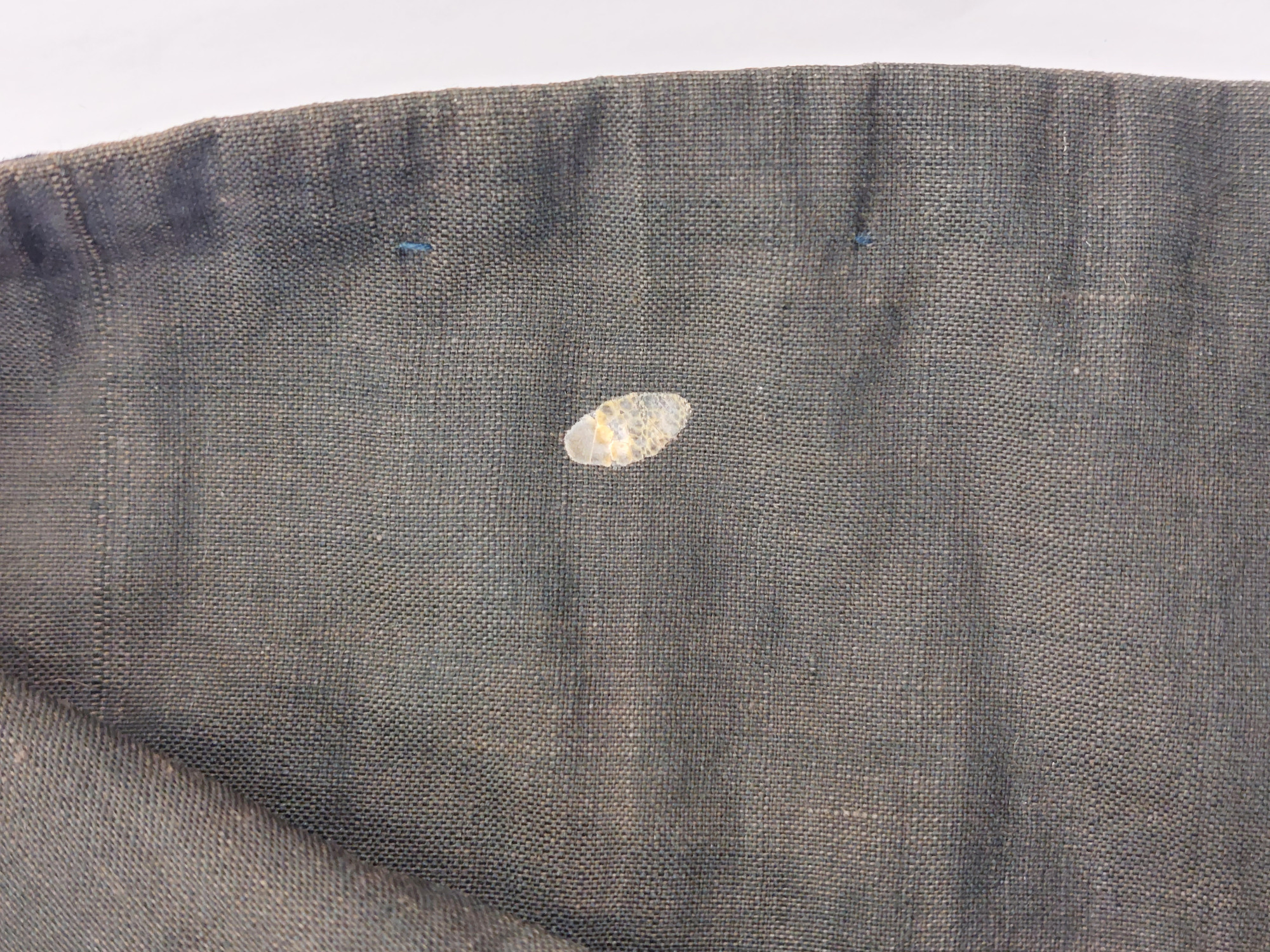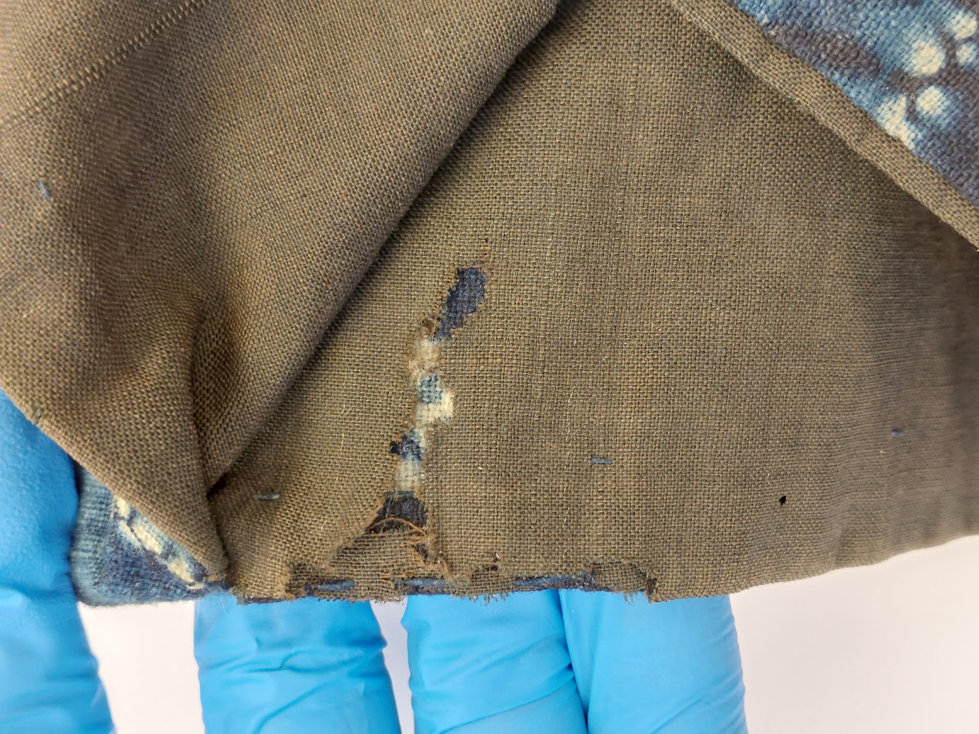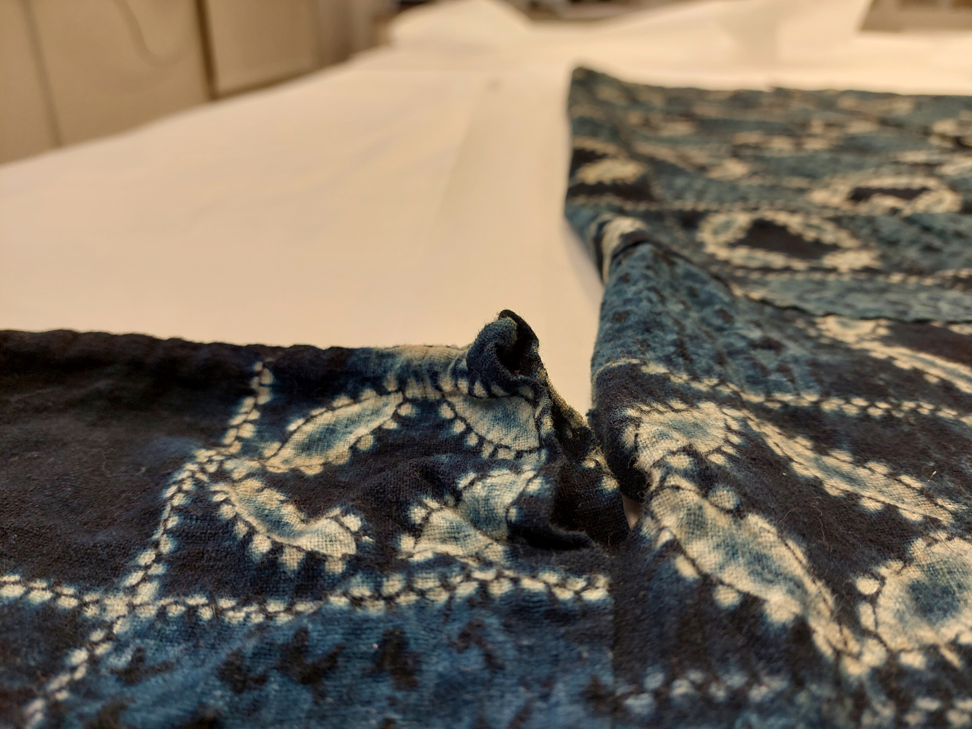 Kimono av indigofärgat bomullstyg, shibori-mönstrat (sydd och knuten shibori). Mönster av cirklar ("shippo") och rutor.