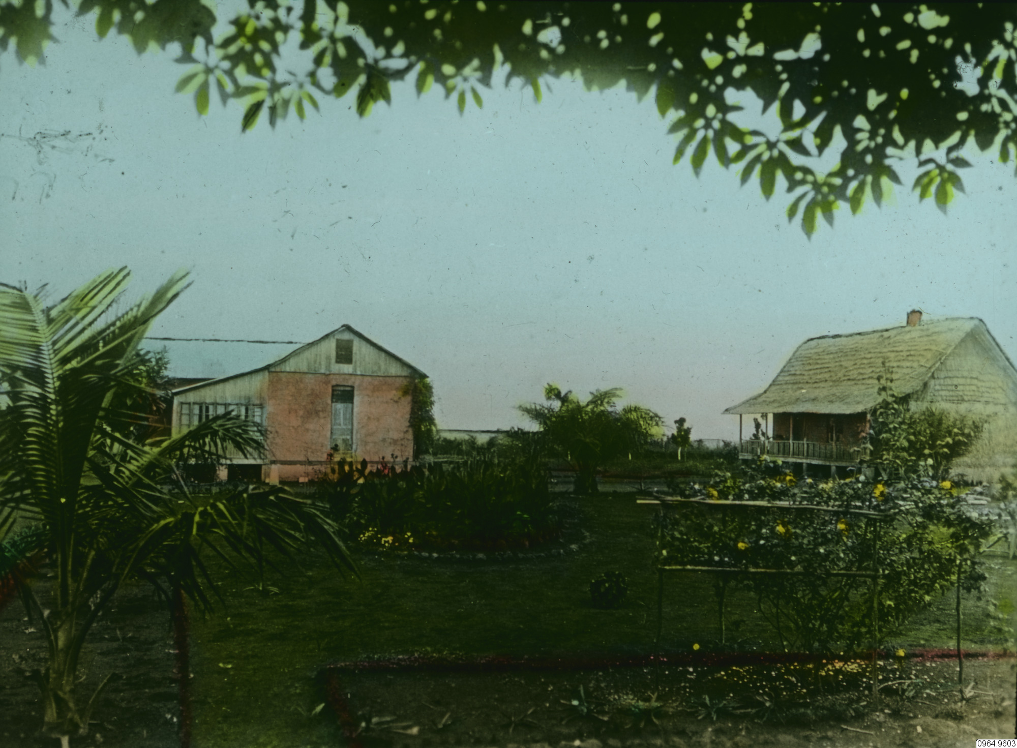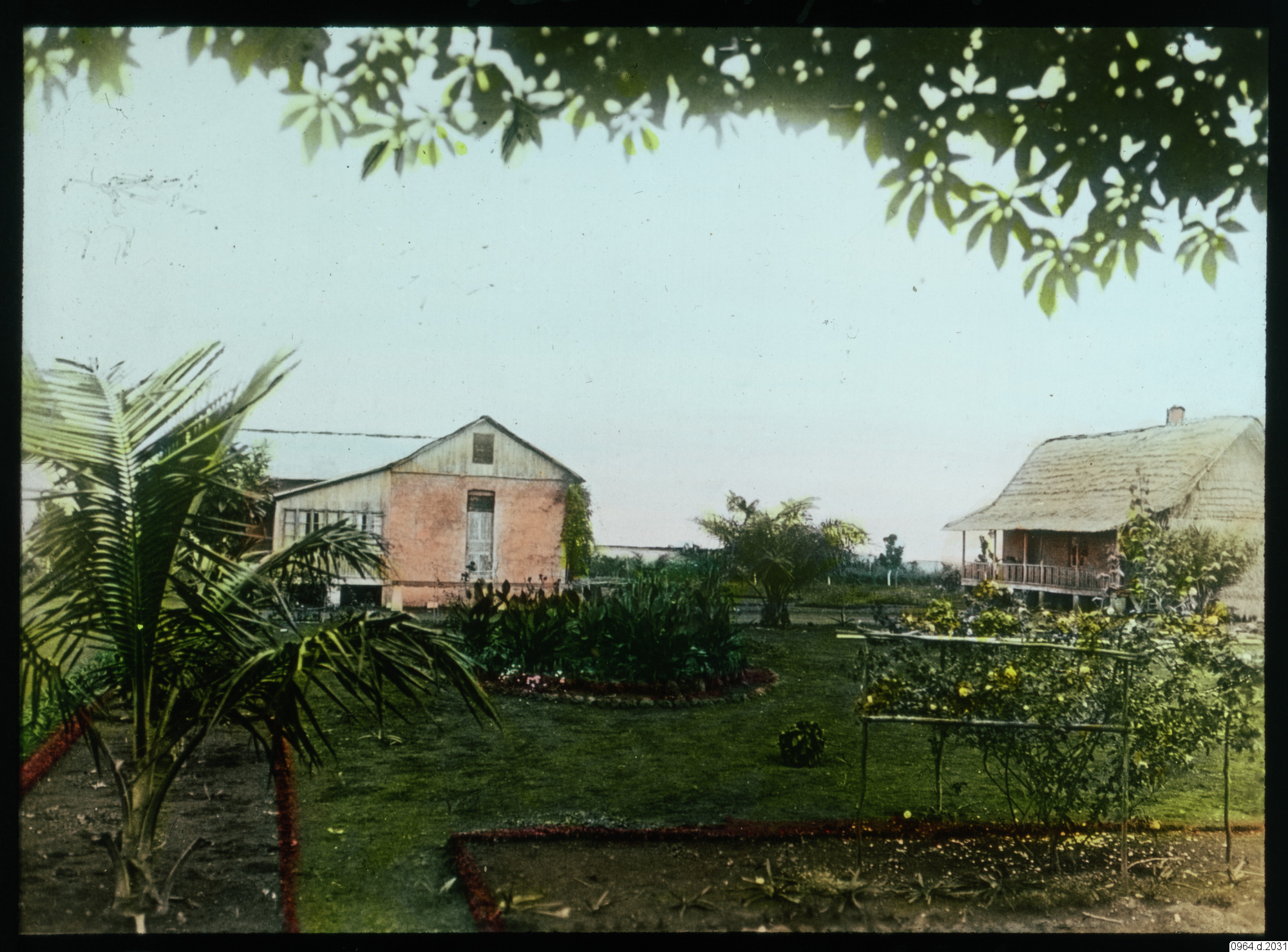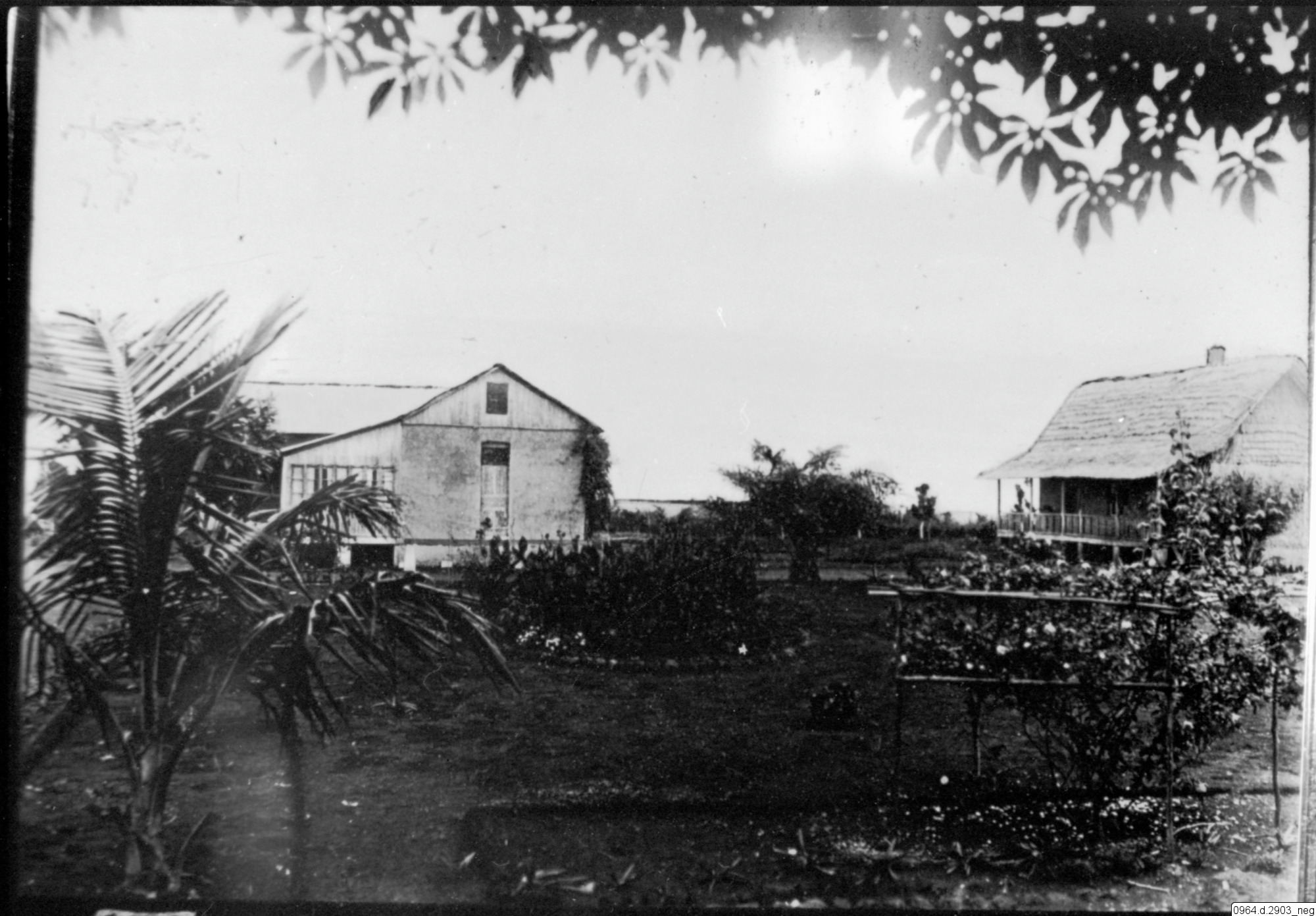 byggnad, hus, missionsstation, kök, träd, personer, trädgård, palm, växter, veranda