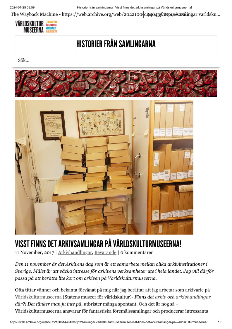 Wowern, Annelie von (2017) Visst finns det arkivsamlingar på Världskultur (blogg)