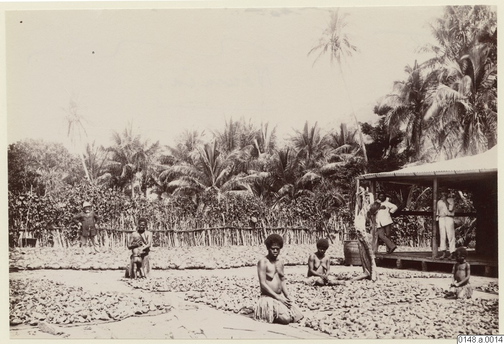 Ett plantage. I förgrunden syns kvinnor från ursprungsbefolkningen som sitter barbröstade och arbetar, omgivna av torkande kopra (d.v.s. det vita "köttet" inuti kokosnötter). I bakgrunden ett hus där två vita män står på verandan. Bakom allt syns palmer.
