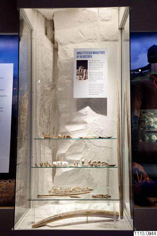 ett halsband av krabb-käkar och en valrossbete med inristade djur och landskapsbilder. (utställningstext, Ursprungsfolk)