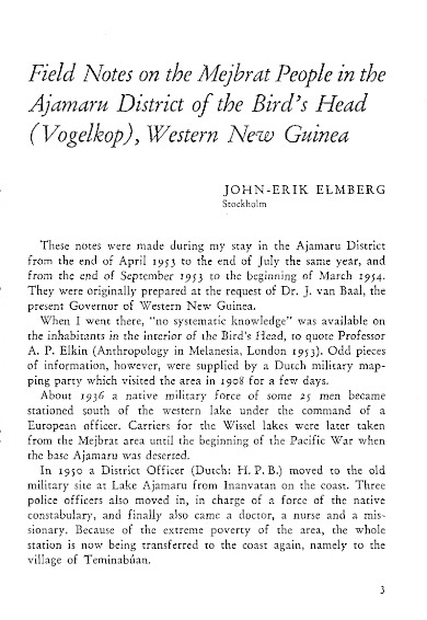 - Elmberg, John-Erik (1955) Field notes on the Mejbrat people in the Ajamaru district of the Bird's Head (Vogelkop), Western New Guinea. Ethnos, Vol. 20 issue 1, p. 1-102