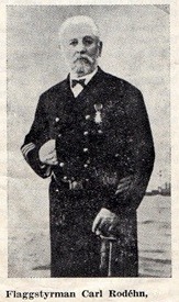 Carl Rodéhn, född 4 maj 1829, Karlskrona, död 25 mars 1906, flaggstyrman. Son till Anders Rodéhn (1796-1842, enligt dödboken 8 född 1798 vilket är fel) och Sophia Andersson (1805-1868). Vid 10 års ålder blev han antagen till skeppsgosse. Som skeppsgosse var han kommenderad på fregatten Josephin 1844, den äldre briggen Snappopp 1845 och på långfärden med fregatten Eugenie 1846-1847. År 1851-53 deltog han i fregatten Eugenies jordomsegling. Gift 1862 med Charlotta Alfrida Fondahn. Han var också sakkunnig på den allmänna etnografiska utställningen 1878 (se katalogkort för 1908.03.0001, Etnografiska museet). År 1882-1883 var han i officerstjänst i båtsmanskasern samt 1883-1884 var han adjutant hos kommendanten å fästningen Kungsholmen. (Örlogsposten 1950)