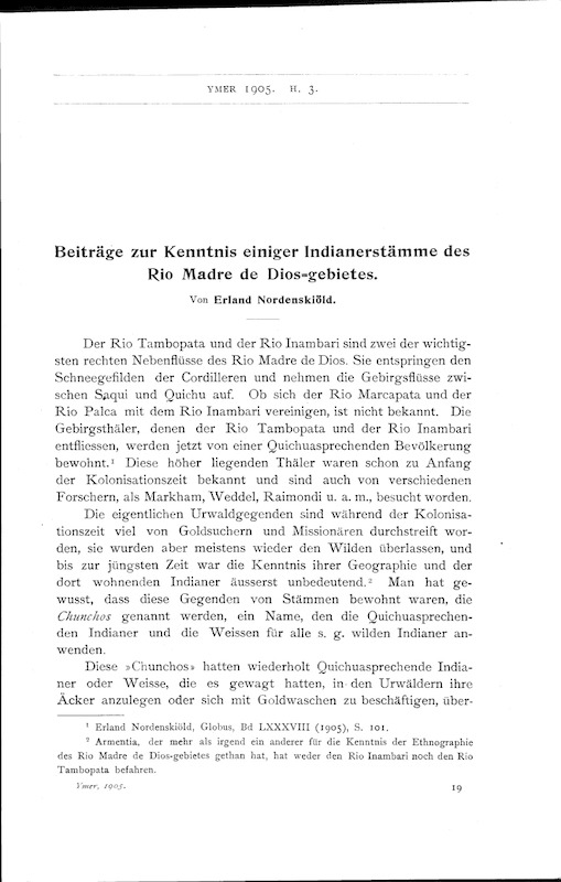 - Nordenskiöld, Erland (1905) Beiträge zur Kenntnis einiger Indianerstämme des Rio Madre de Dios-gebietes, Ymer; 1905, H. 3