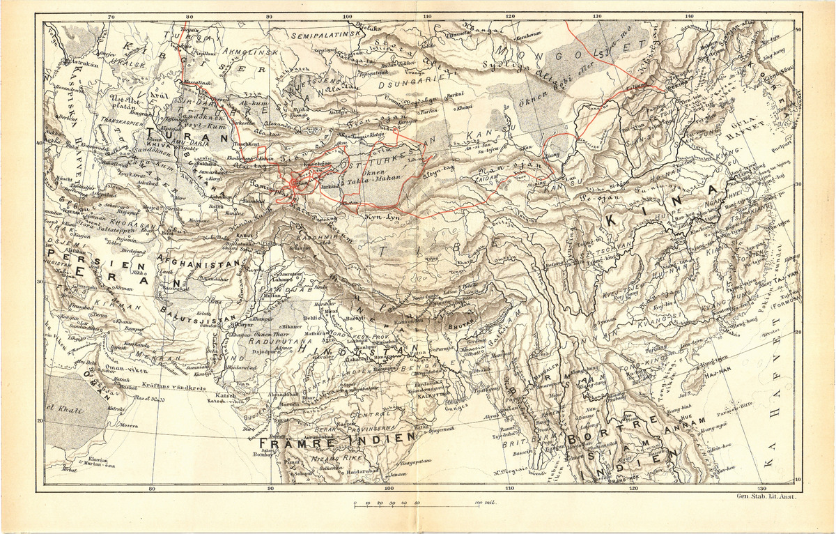 Mellan 1893 och 1897 reste Hedin genom bland annat Pamir, Tarimbäckenet med Taklamakanöknen och norra Tibet. Av den tillryggalagda sträckan på 26 000 km kartlade han 10 498 km, varav 3 500 km tidigare inte hade utforskats.