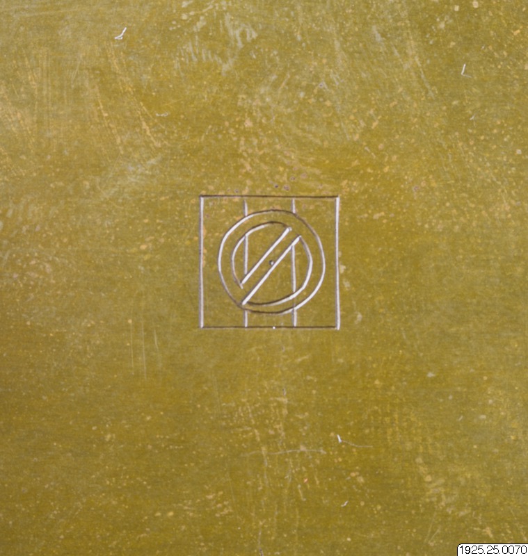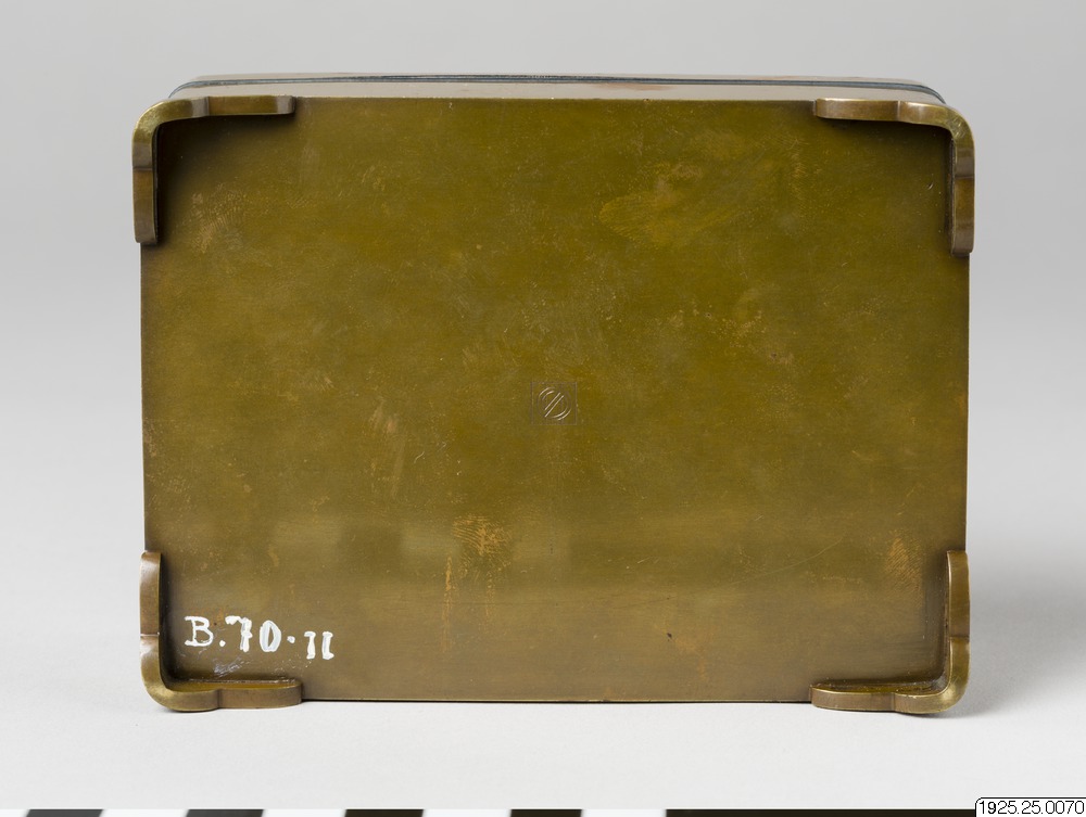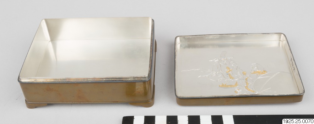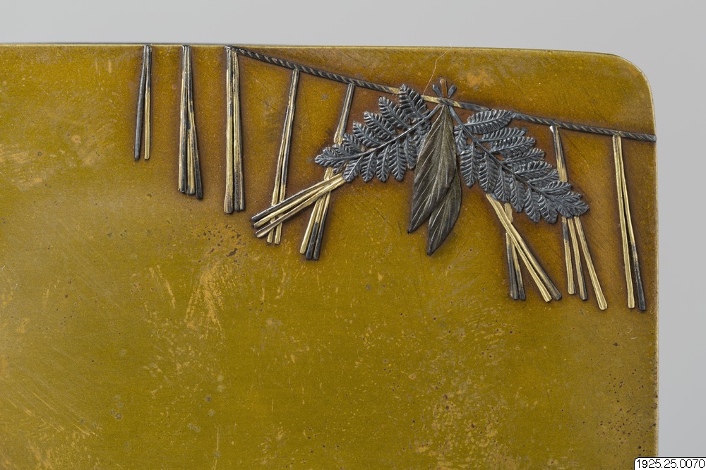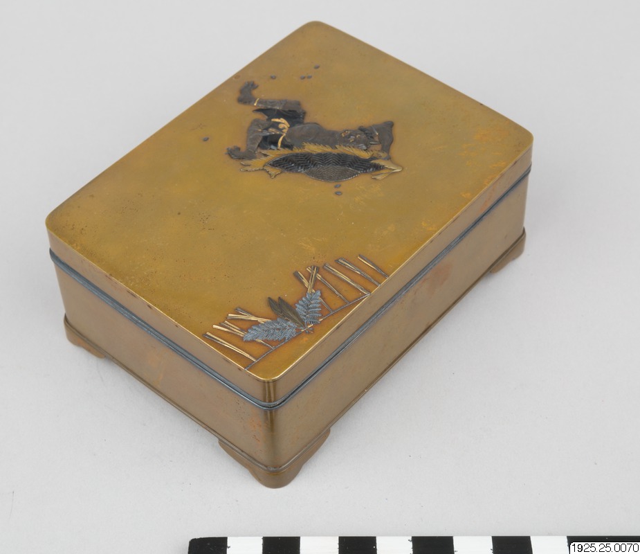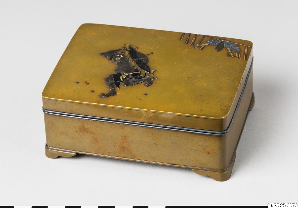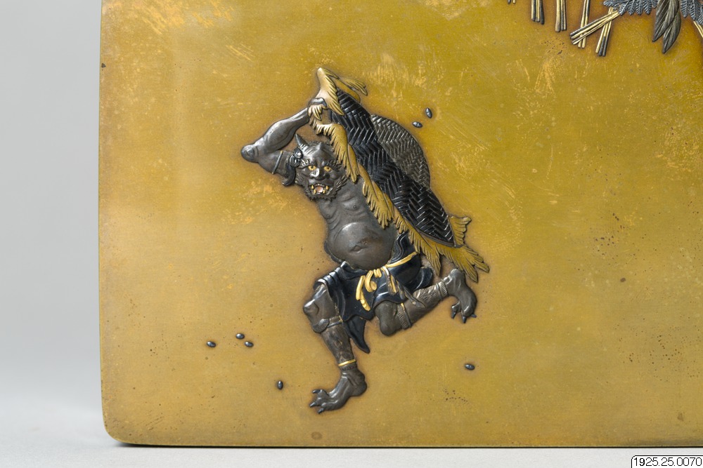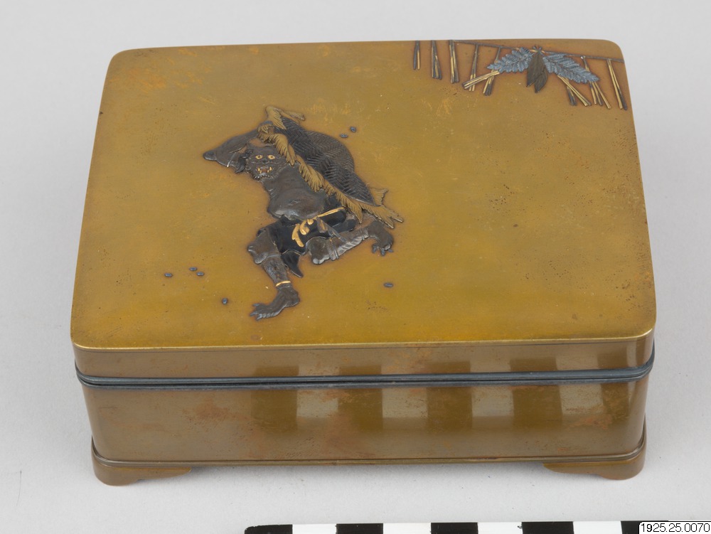 Ask av gul brons. Locket dekorerat i relief med brons, shakudō och shibuichi: en oni (demon) som med halmhatten på ryggen söker skydda sig för det regn av bönor man försöker driva bort honom med. På lockets insida en gravering med två lyckogudar: Ebisu med taifisk och metspö samt Daikoku som bredvid sig har sin trähammare och säck. Locket är invändigt fodrat med silver. Signatur. Nogawas märke, ett slags N.O.