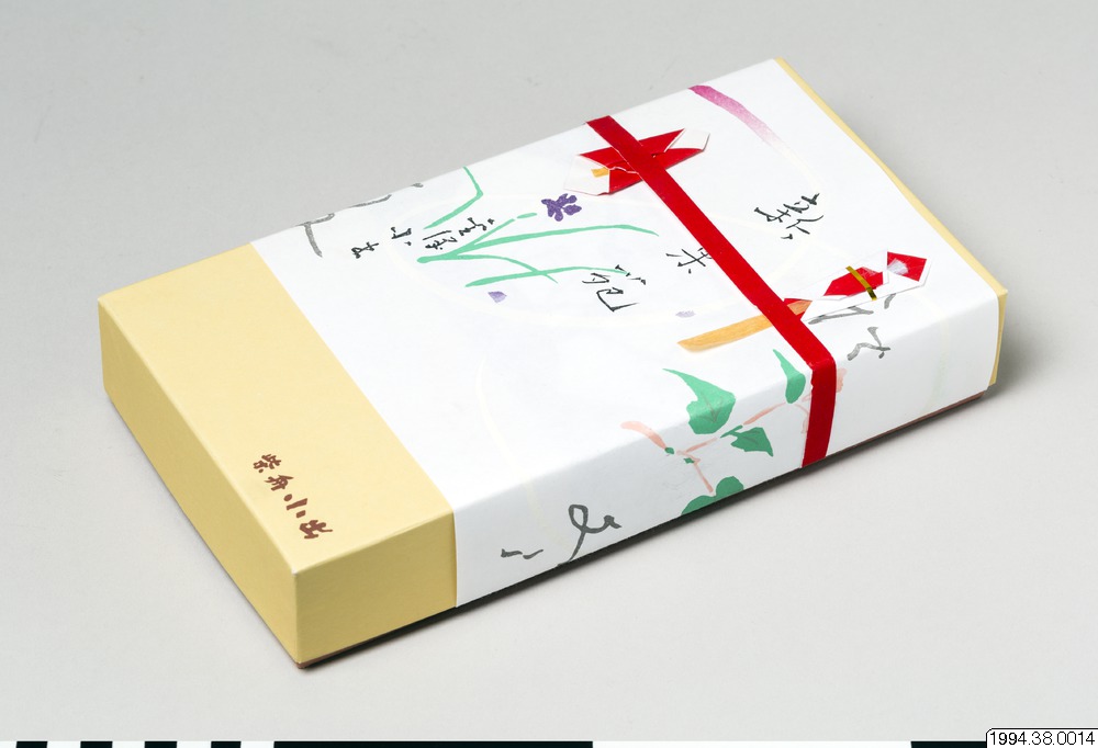- Ask av kartong, rektangulär. Innehåller en innerlåda av plast med 18 fördjupningar.I dessa fyra öppnade förpackningar av rispapper med en enkel blomma som motiv på framsidan. I lådan även ett dubbelvikt papper med blommotiv och japansk text.