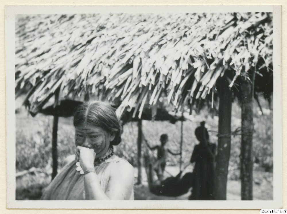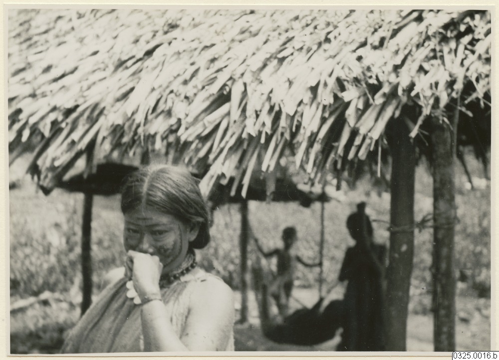 - Kvinnor med halsband och ansiktsmålning en står framför hyddan och två människor står under hyddan.