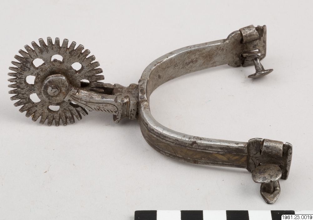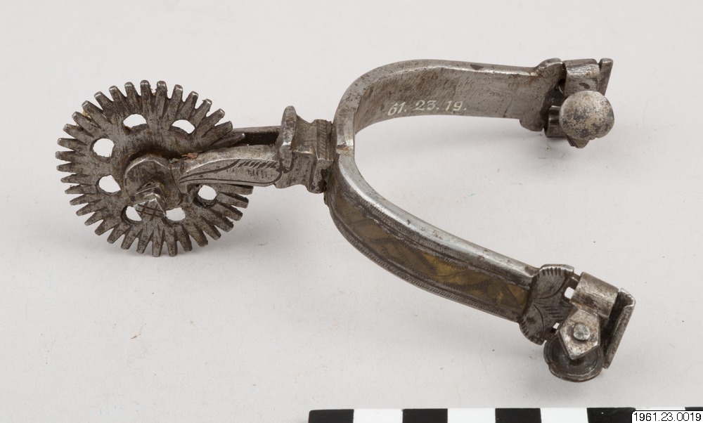 - Sporre av järn, med klinga av tandad skiva. Innanför taggarna genombruten dekor av närmast halvcirkelformade öppningar. Dekor av infälld metall och ingraverade linjer.