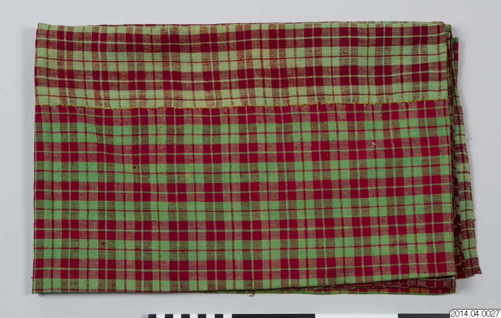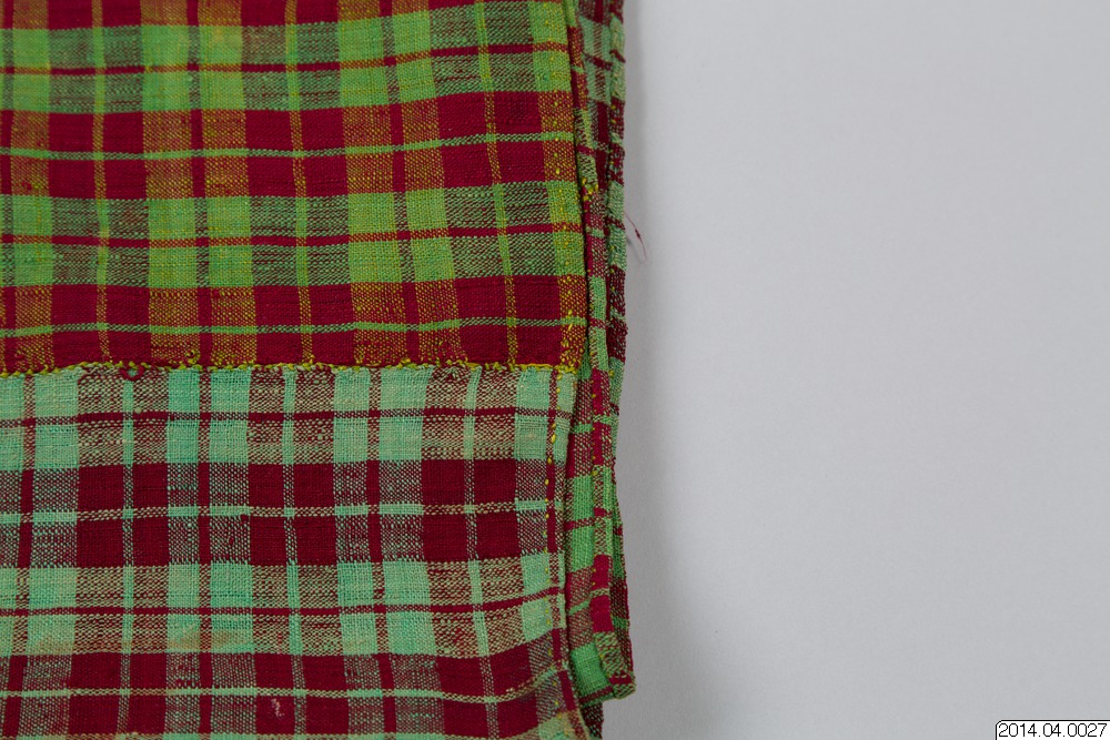 En sjal av grön och rödrutigt tyg, enligt uppgift av siden. Denna typ av sjalar uppges ha använts till bröllop. Byn Midun/Midih, Tur Abdin. KGG/föremålsanteckningar.