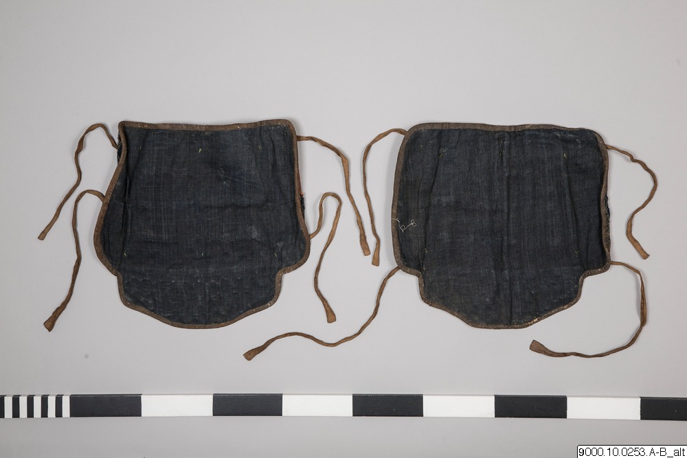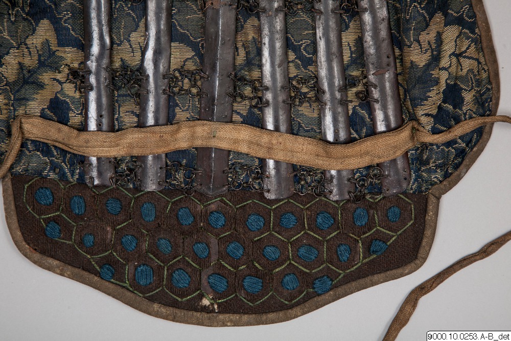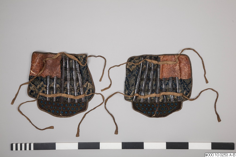 Benskydd, del av par. Brunlackerade lameller sammanfogade med ringbrynja på en botten av blå, mönstrad brokad. Insidan fodrad med blått tyg. Brunt skinn i nedre hörnet. Ljusa knytband. Övre delen av skyddet med insydda nitar täckta av brun textil och blå silkessnören.