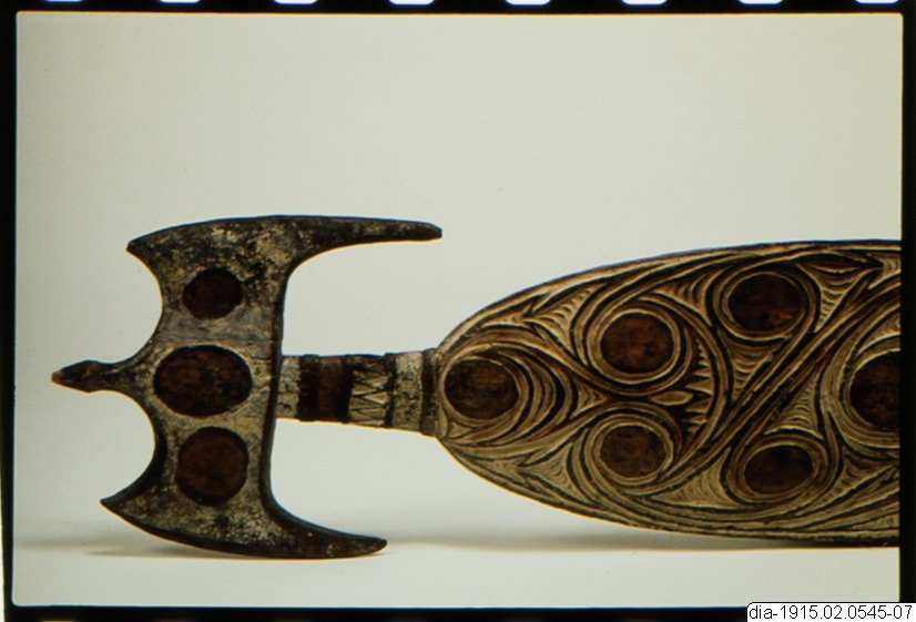 Krok, med ansikte skuret som en mänsklig gestalt ur ett stycke trä. På mitten formad som en sköld dekorerad med kurviga linjer och cirklar skurna i låg relief. Målad i rött och vitt. Genomborrat hål i pannan och ett växtfibersnöre knutet genom näsan.
