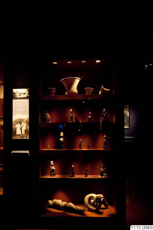 Ett Kongomuseum i Söderfors I missionshuset i Söderfors kunde församlingsbor och andra få kunskap om hur man levde i en kongolesisk by, hur man jagade och odlade, hur man klädde sig och vad man åt, hur sjukdomar behandlades och hur relationerna till förfäderna och mellan människor gestaltades. Hur såg Söderforsborna på dessa föremål från Kongo? Såg de på dem som beläten, som fick kristendomens ljus att skina så mycket klarare. Eller skickligt utförda föremål, skapade av människor som var väl skickade att klara sin försörjning? Josef Ekstam var missionär i Kongo åren 1904-1925. Här är han fotograferad tillsammans med sin familj inför sista hemresan. Det var han som hade sänt hem alla föremålen från Kongo till sin hemförsamling i Söderfors. (utställningstext)