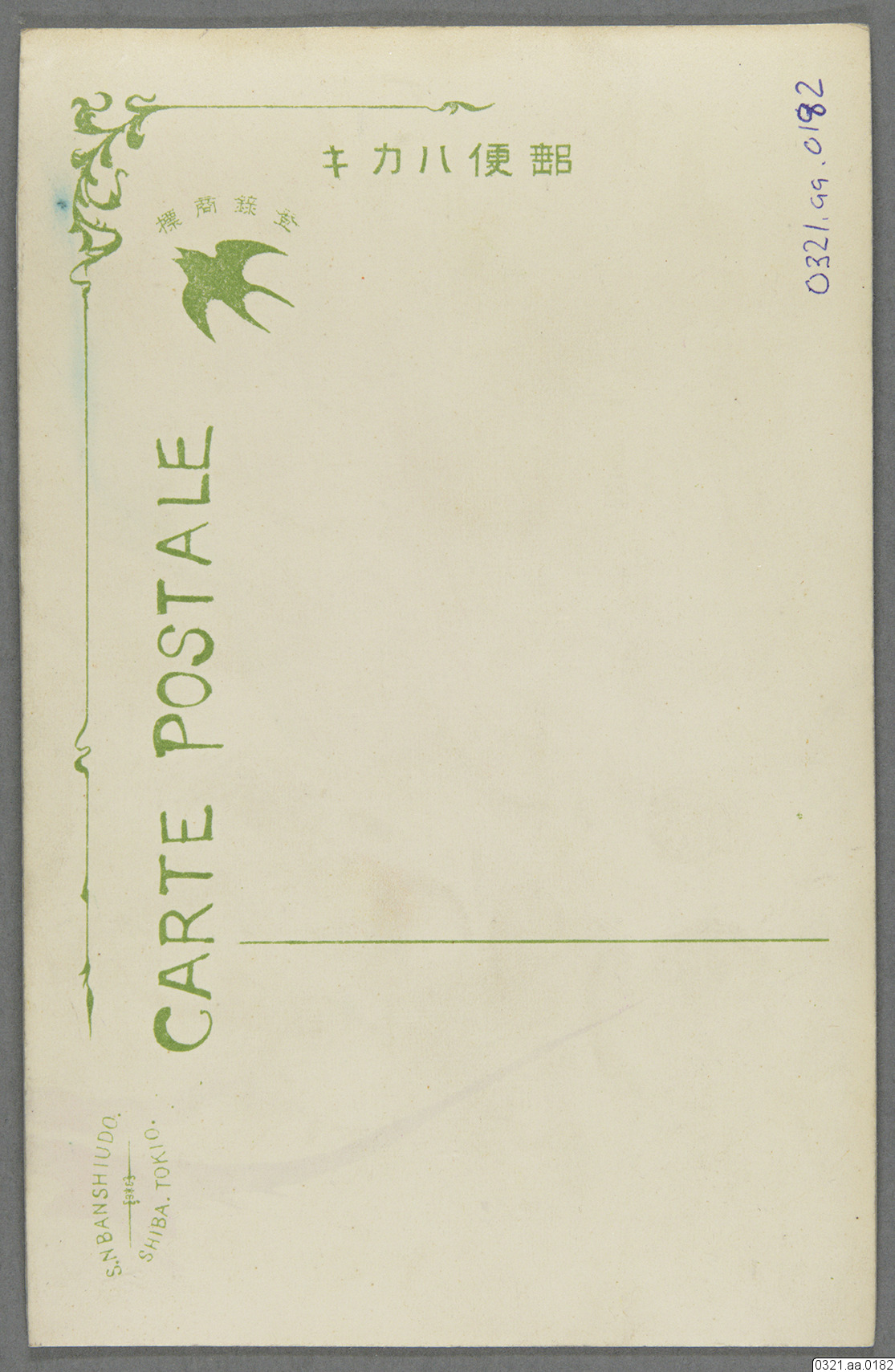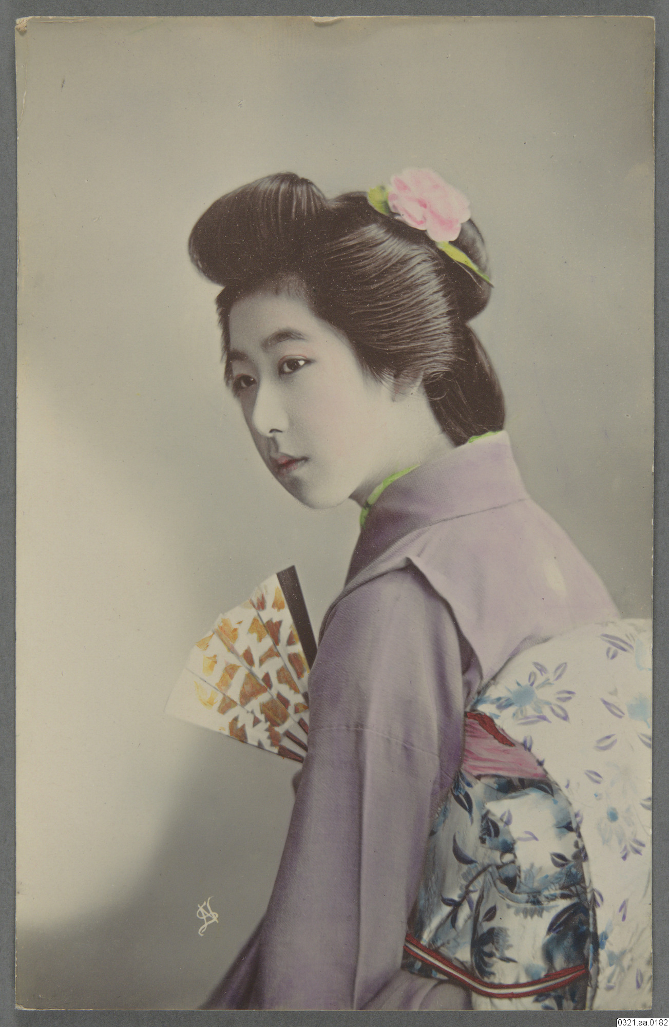- Kolorerat vykort, porträtt av geisha med solfjäder, Carte Postale, S.N Banshiudo, Shiba, Tokio, 0321.aa.0182