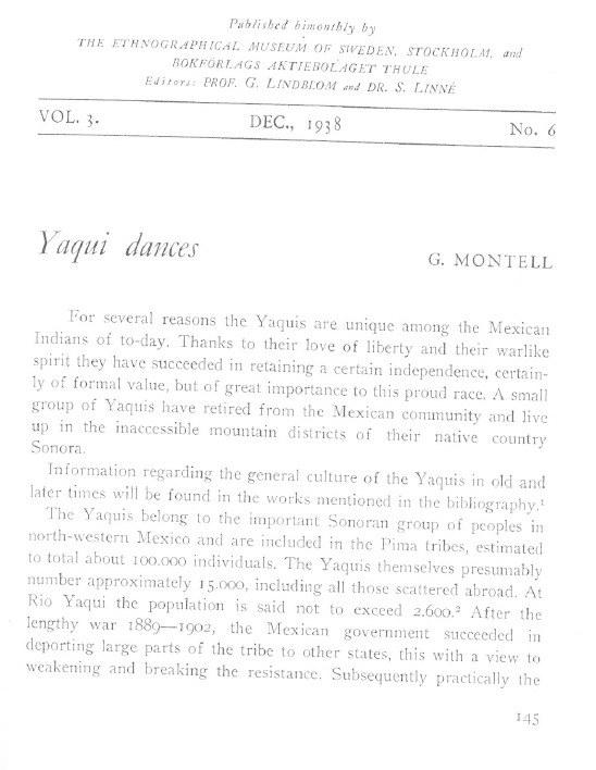Montell, Gösta (1938) Yaqui dances. Ethnos Vol. 6, no. 3