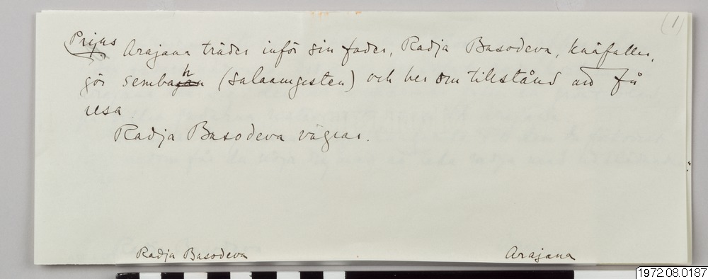 Tyra Kleens handskrivna svenska utkast till ”The story of Arayana”. Bläck på lärr tonat papper, synlig vattenstämpel ”Papyrus Mölndal”