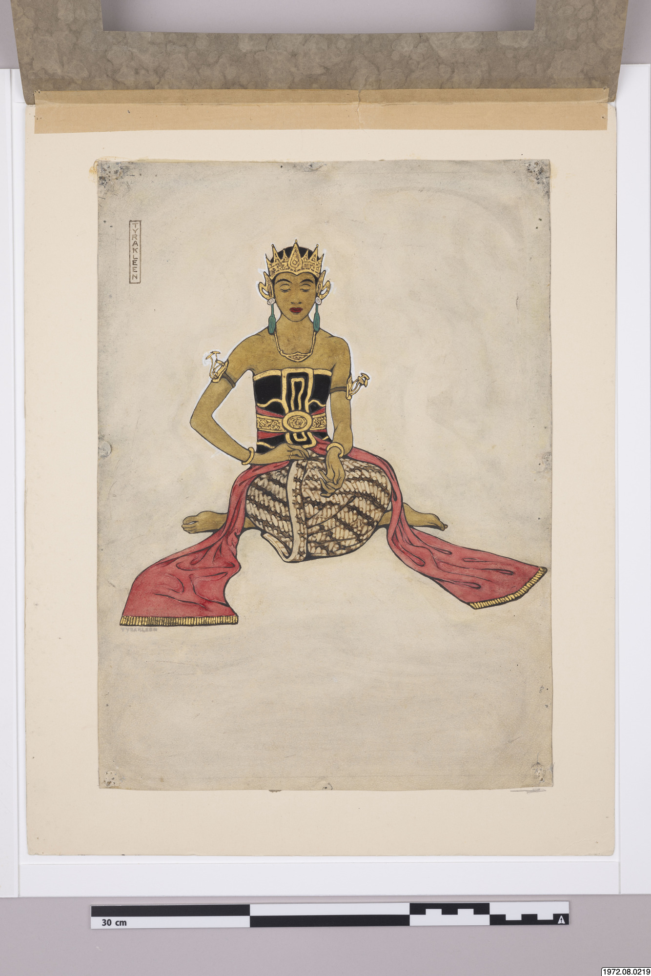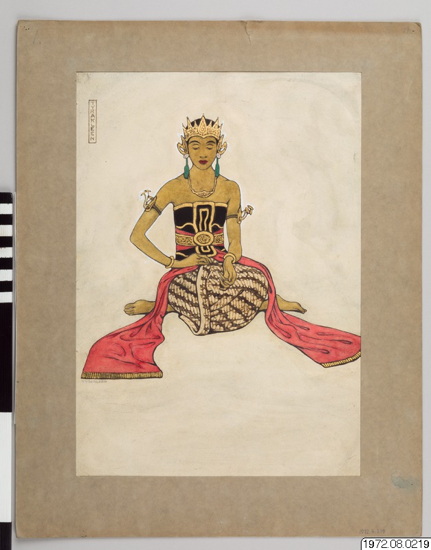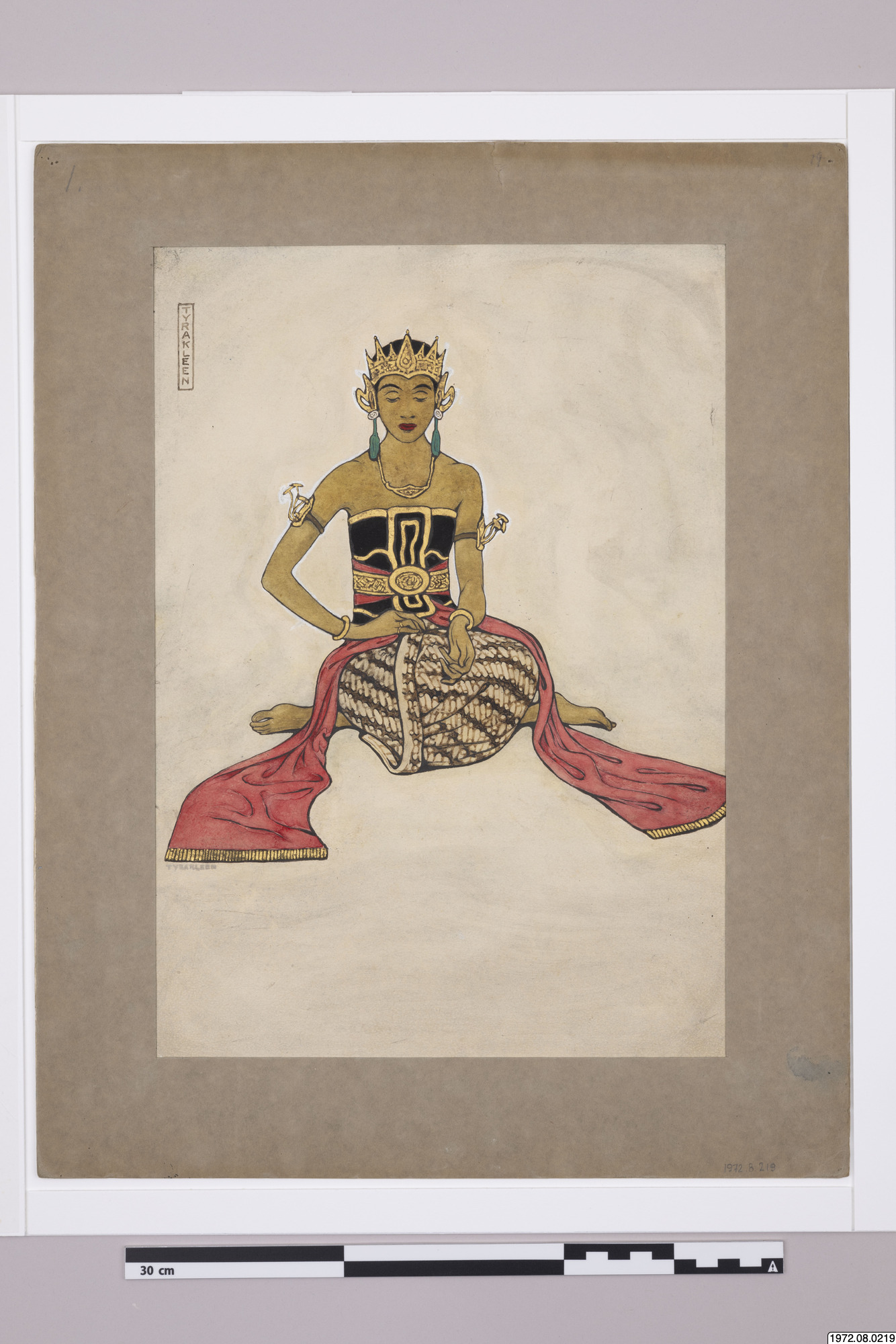 Verket föreställer kvinnlig serimpidansare. Positionen är ”linggih rakit”: sittande med korslagda ben, vänster hand, med handflatan öppen vilar på vänster knä, höger hand vilar över höger höft. Detta är inledningspositionen. När dansarna har kommit in och fram till Susuhunans tron sätter de sig ner i denna position.