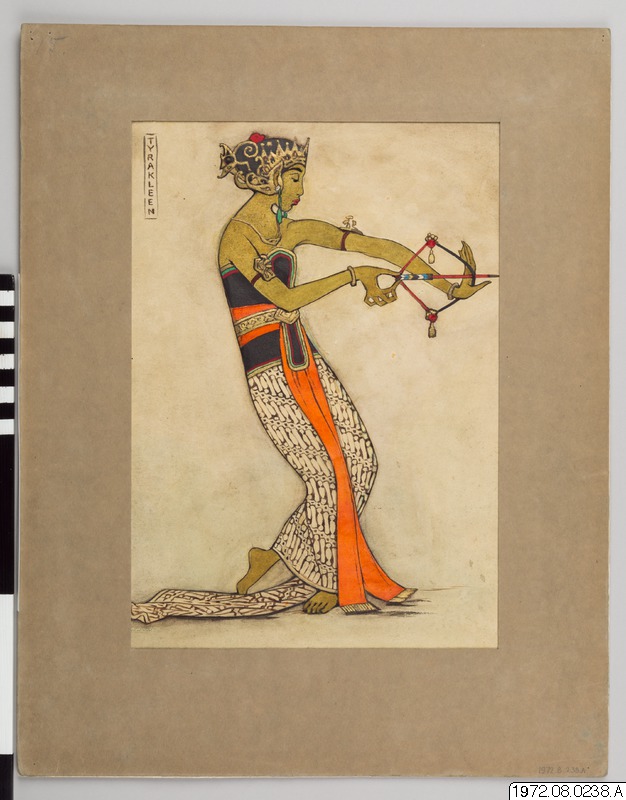 Verket föreställer kvinnlig Bedaya Ketawang-dansare. Positionen är en version av ”bedaja manah” på modern indonesiska ”bedaya manah" och har betydelsen ”att skjuta en pil med pilbåge”: upprätt dansare och framställer ett stridsmoment när bågen spänns. Den utsträckta vänsterhanden håller bågen till vänster om kroppen medan höger håller i pilen och drar i strängen. På baksidan av verket finns överstrukna anteckningar i blyerts.