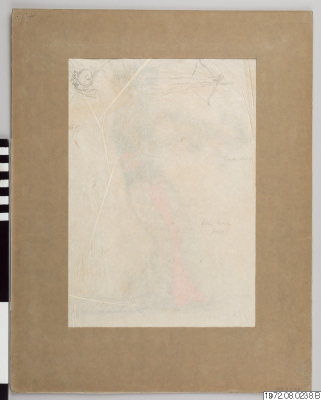 Akvarell med accentuering av guld och gouache. Signerad TYRA KLEEN. Ett tunt semitransparent skisspapper har varit vidhäftad på akvarellen 1972.08.0238.A, detta ark ligger löst 1972.08.0238.B.