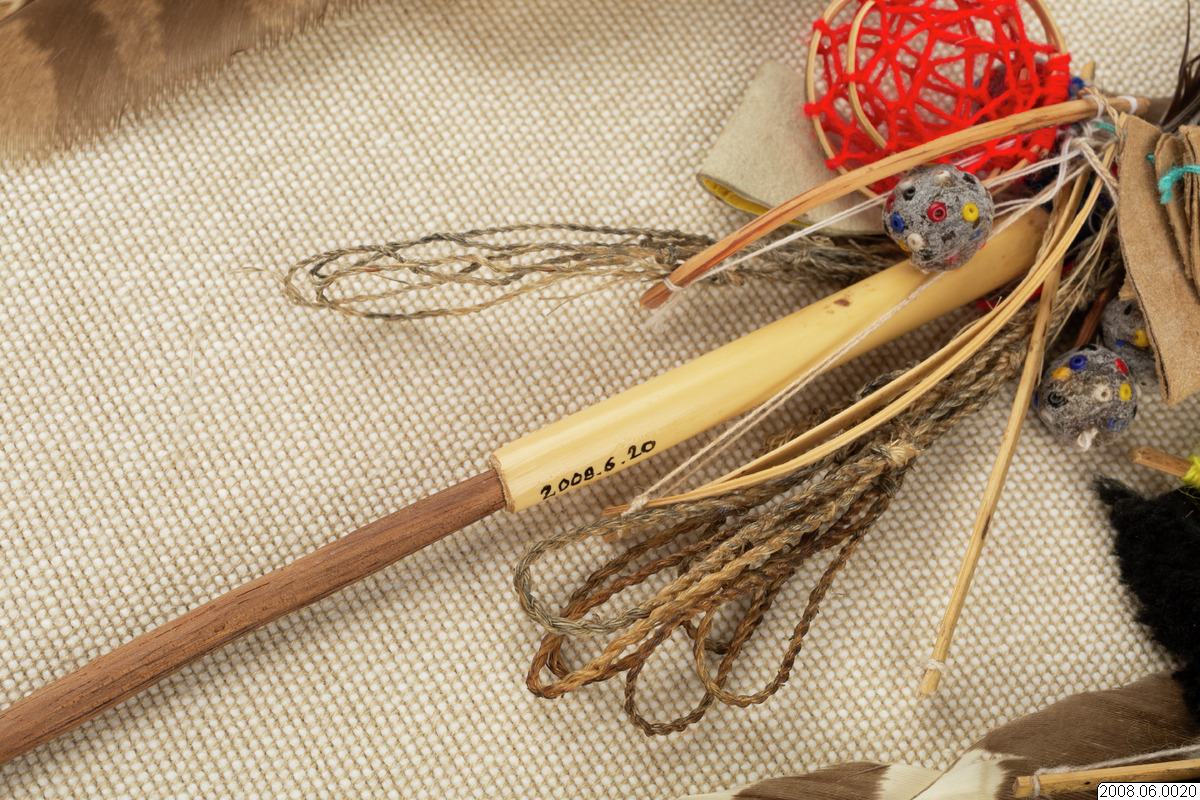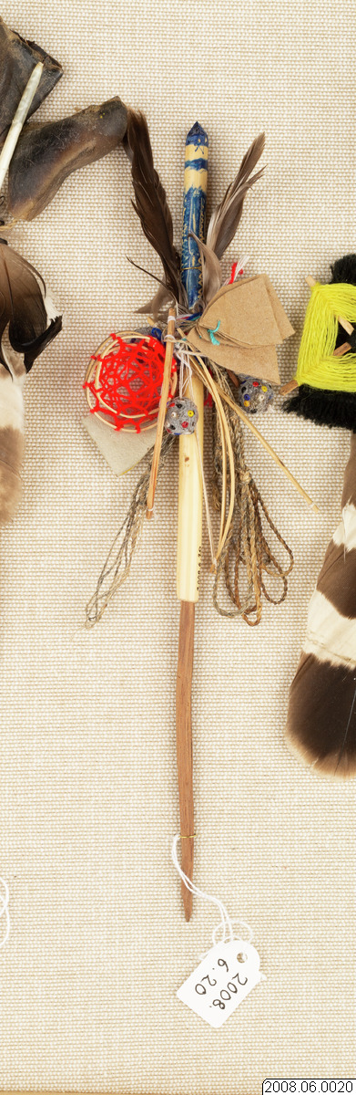 En budskapspil. Pilen är tillverkad till trä, med hängen av garn, trä, vax, fjädrar och papper. Budskapspilen består av en carizodel, ihåligt rör, som bemålats med blå dekor och änden skårad som om den skulle användas i en pilbåge. I carizodelen har en spetsig trästicka limmats fast. På budskapspilen hänger två olika symboler och två korta fjädrar.