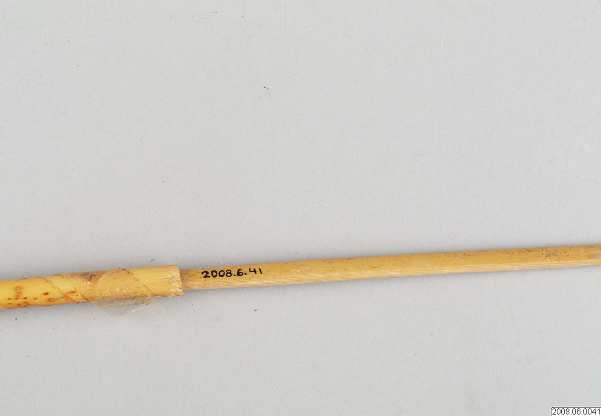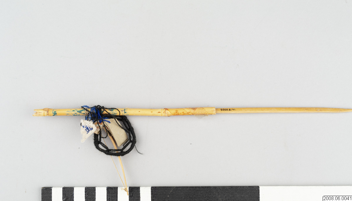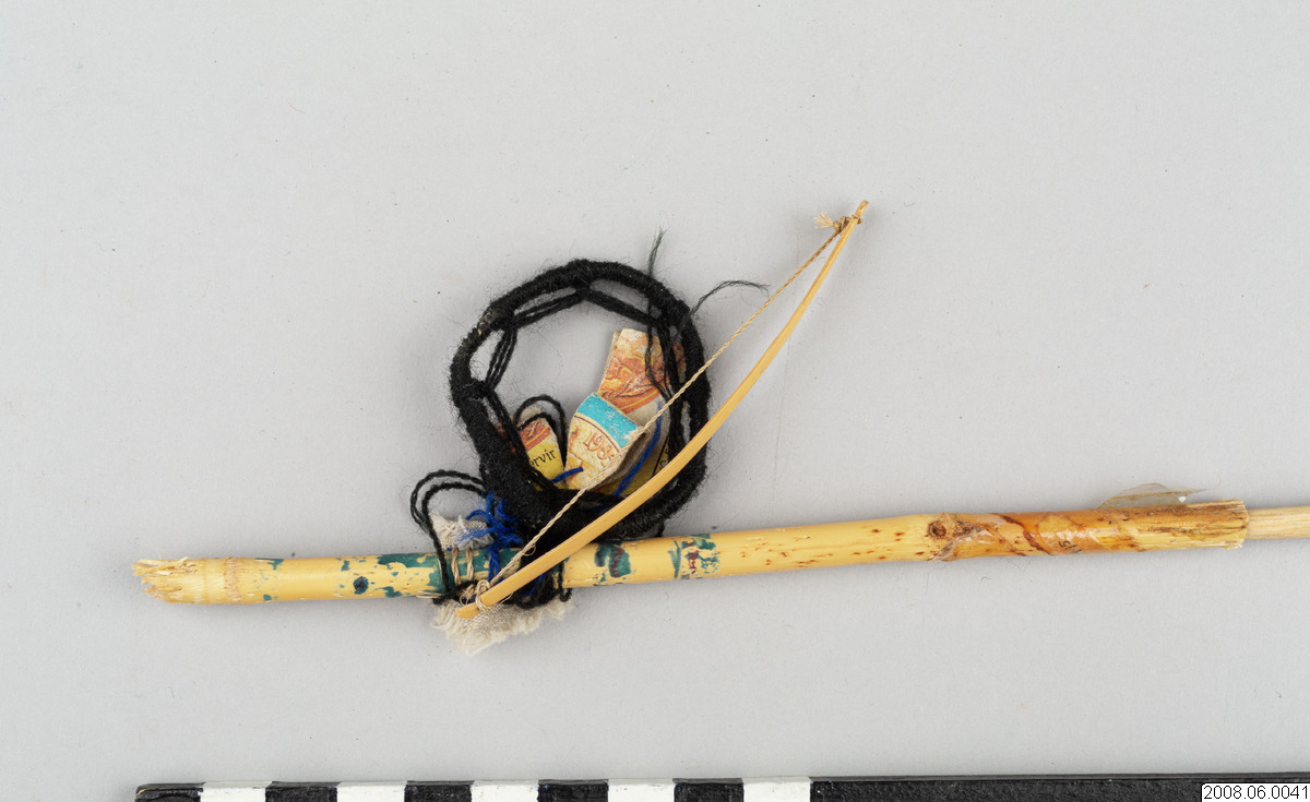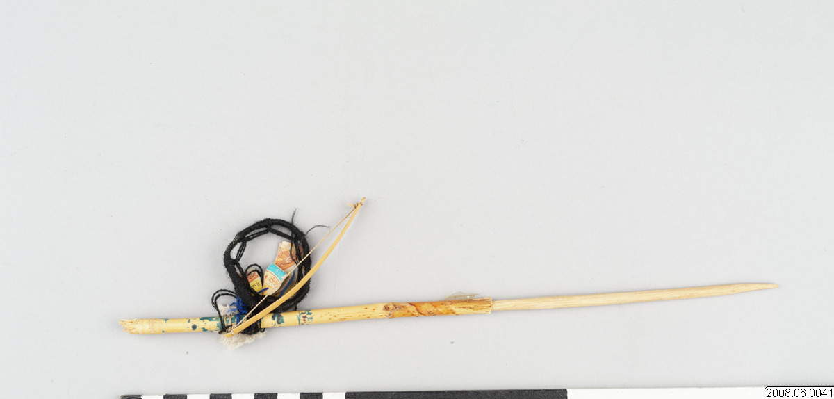 En budskapspil. Pilen är tillverkad av trä, med hänge av garn, papper och trä. Budskapspilen består av en carizodel, ihåligt rör, som bemålats med svart dekor och med änden skårad som om den skulle användas i en pilbåge. I carizodelen har en spetsig trästicka limmats fast. På budskapspilen hänger fem symboler.