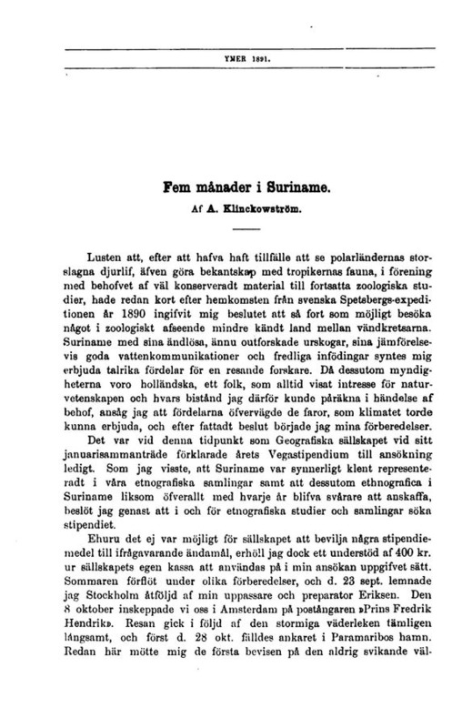 Klinckowström, Axel (1891) Fem månader i Suriname. I Ymer 1891, Elfte årgången. s.230-245