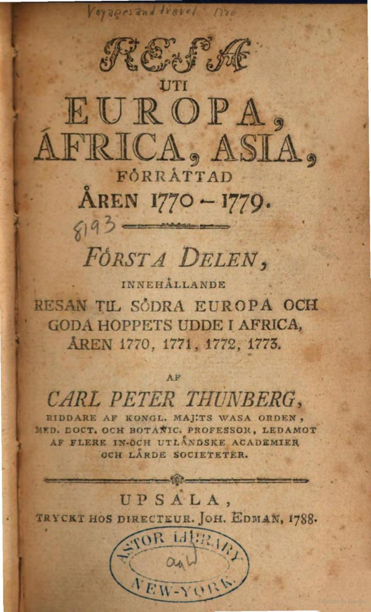 - Thunberg, Carl Peter (1788). Resa uti Europa, Africa, Asia, förrättad åren 1770-1779. Af Carl Peter Thunberg ...Uppsala. 1-4. 1788-93. [Del 1], Första delen, innehållande resan til södra Europa och Goda Hoppets udde i Africa, åren 1770, 1771, 1772, 1773. Upsala, tryckt hos directeur. Joh. Edman, 1788.. Uppsala