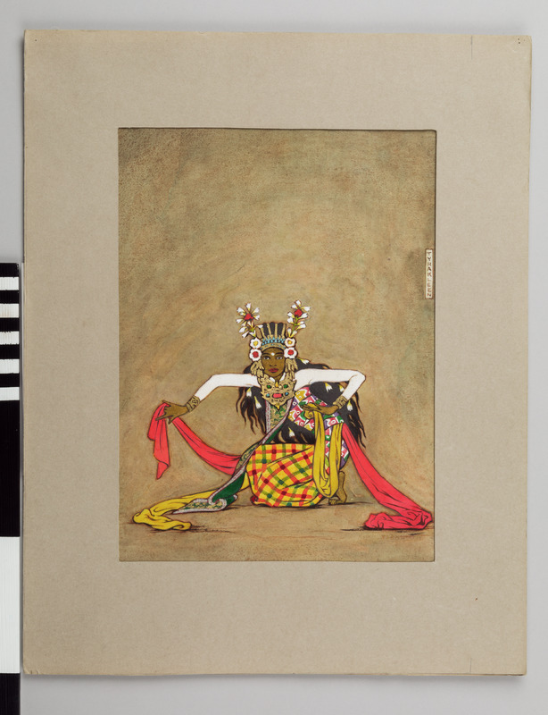 Kvinnlig dansare som knäböjer åt vänster, klädd i gul svepkjol med gröna och röda ränder som tillsammans formar rutor. Torson lindad med ett brett band mönstrat i rött, gult grönt och vitt, därunder en vit tröja med långa ärmar. Två långa danssjalar, en i rosa och en i gult fångas upp, den gula med vänster hand böjd mot torson och den rosa med höger utsträckt arm och hand medan de andra ändarna av de bägge sjalarna ligger konstfullt draperade på golvet framför dansaren.