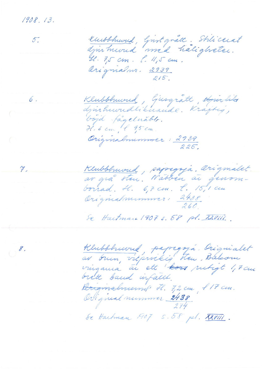 - Handskriven sida ur förteckning över samling 1908.13, inköpta gipsavgjutningar från Carnegieinstitutet i Pittsburg.