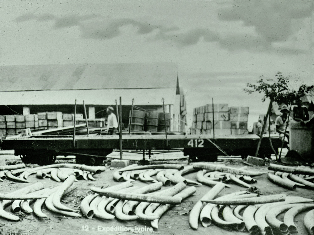 - Vykort. En stor mängd elfenben ligger uppradade. En stor transport som ska skeppas vidare över haven.