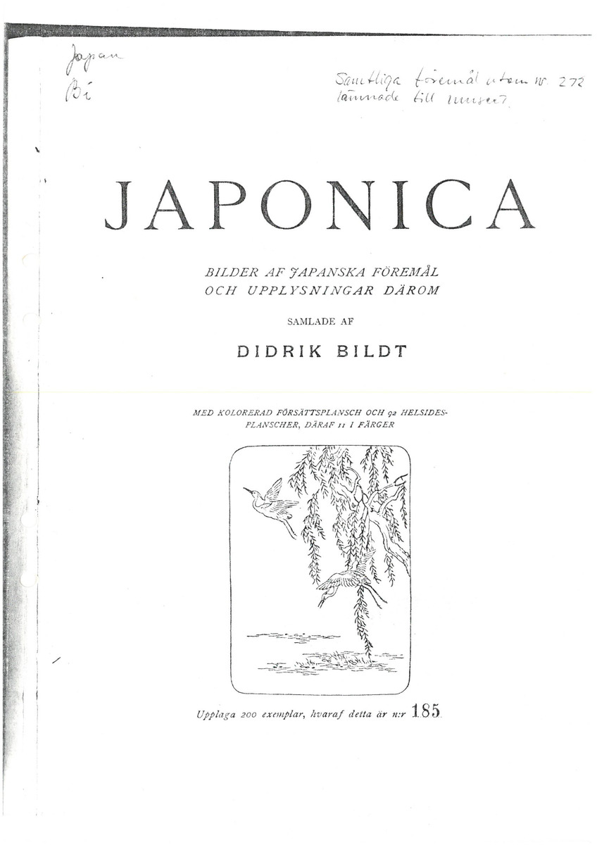 - Bildt, Didrik (1914). Japonica: bilder af japanska föremål och upplysningar därom : med kolorerad försättsplansch och 92 helsidesplanscher, däraf 11 i färger. Fritzes bokh.