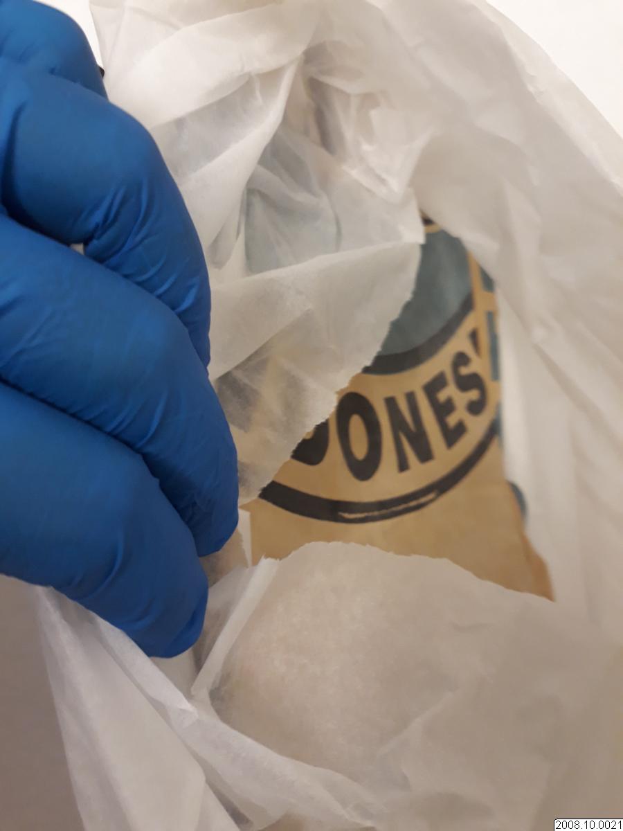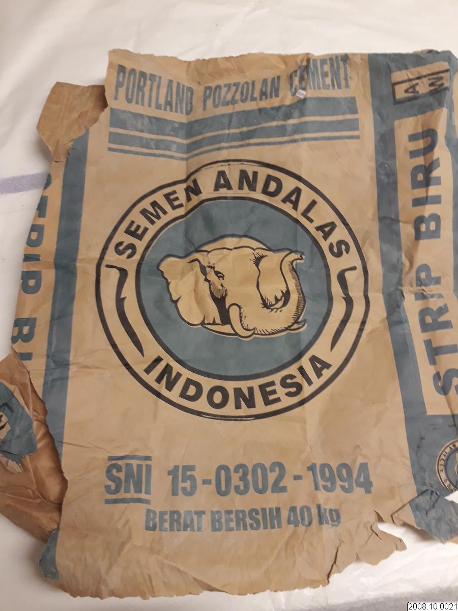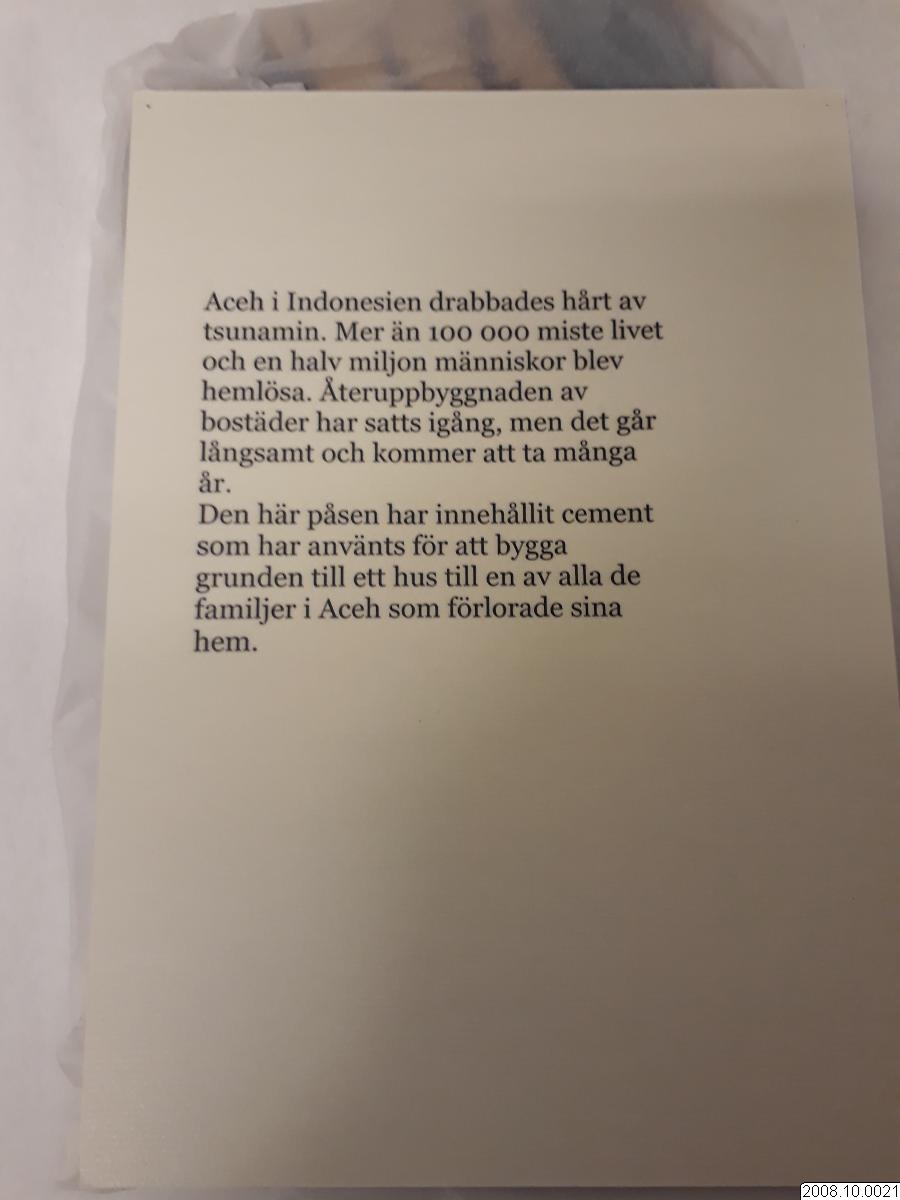 Från utställningstext: Aceh i Indonesien drabbades hårt av tsunamin. Mer än 100.000 miste livet och en halv miljon människor blev hemlösa. Återuppbyggnaden av bostäder har satts igång, men det går långsamt och kommer att ta många år. Den här påsen har innehållit cement som har använts för att bygga grunden till ett hus till en av alla de familjeri Aceh som förlorades sina hem.