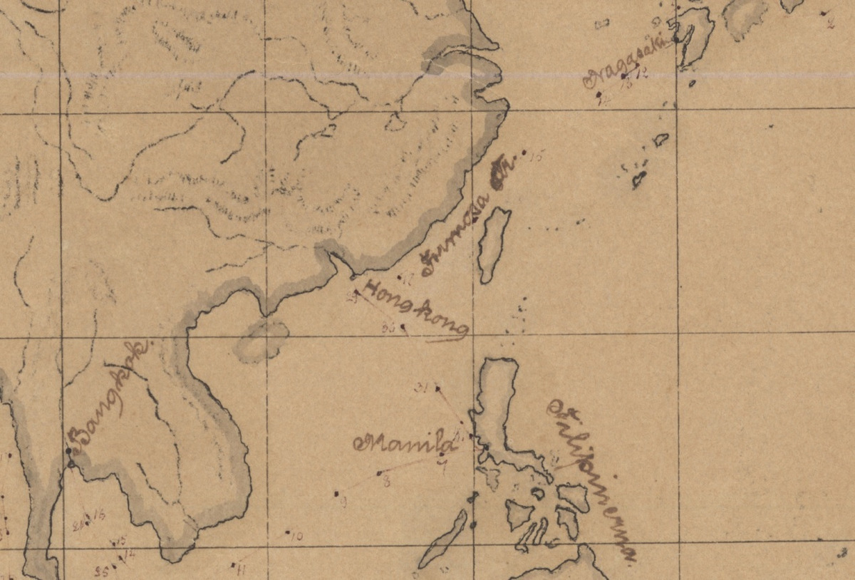 Vanadis ankom till Hong Kong 18 oktober. Planen var egentligen att åka till Kina och Shanghai men krig mellan Kina och Frankrike (1883-1885) förhindrade detta. I Stolpes föremålssamling finns två föremål från Japan och fyra från Kina som sägs vara inköpta i Hongkong. Stolpe mottog kinesiska och koreanska föremål av Benedict Carlos i Newschang (Yingkou) i norra Kina som han skickar till Sverige vilket tycks ha skett när Vanadis var i Hongkong (Erikson 2015). Stolpe skickar ett brev till Sverige 26 oktober 1884. Det finns också två ovala oljemålningar som lär komma från Oscar Ekholm och som avbildar en djonk med proveniens "Hongkong". Ett myntsvärd från Ulff attribueras också till Hongkong.