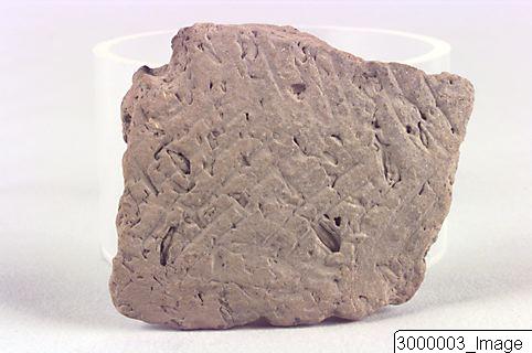 - Sherd with a herring bone pattern void of a centre line. Well fired ware, reddish brown core. Pattern originally deep, now heavily eroded. Once part of a large bodied vessel.