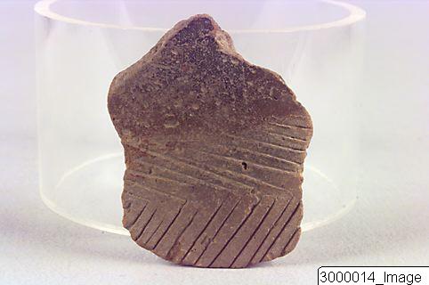 - Sherd with herring bone pattern. Well fired, red brown core. The interior has clear traces of scraping marks. Exterior red brown, faded around decoration, otherwise polished. Diagonal incised lines.