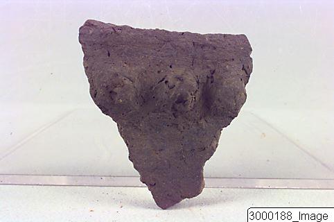 - Rim sherd of a poorly fired pot, vessel. Black core, rounded rim, red brown interior, exterior dull black featuring three juxtaposed nubbles 1.5cm. below the rim.