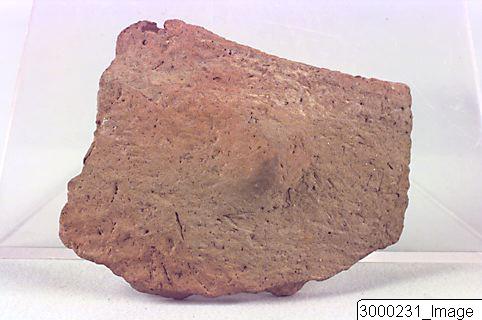 - Rim sherd of a well fired pot, vessel. Red core. red interior and exterior (eroded). Small round exterior nubble 2cm . below the rounded rim.
