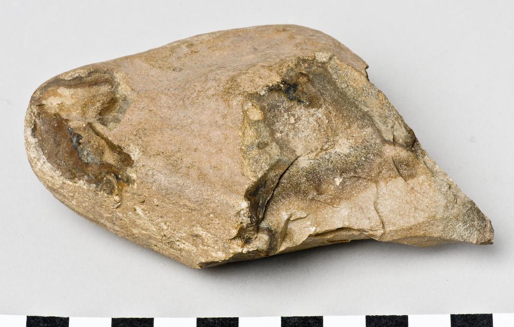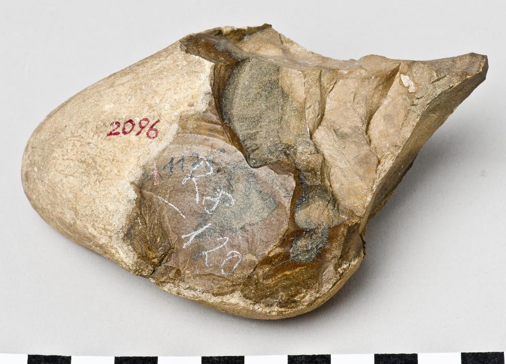 - Drill, made from a large flint core. Only the pointed tip is worked, crust is covering the rest of the piece. Greyish brown flint.