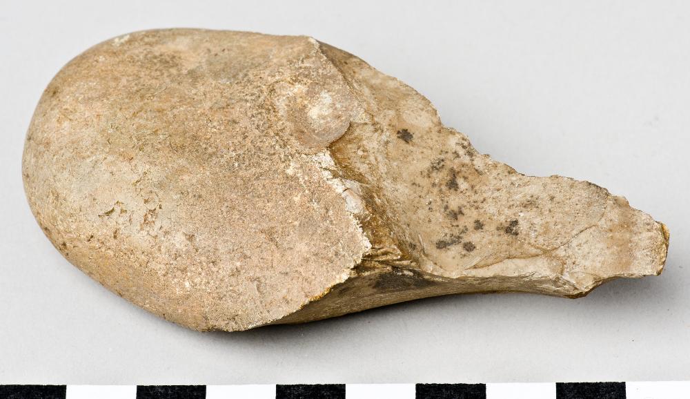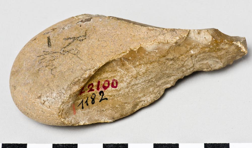 - Drill, made from a large flint core. Only the pointed tip is worked, crust is covering the rest of the piece. Brown flint.