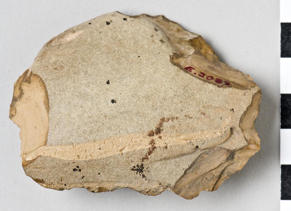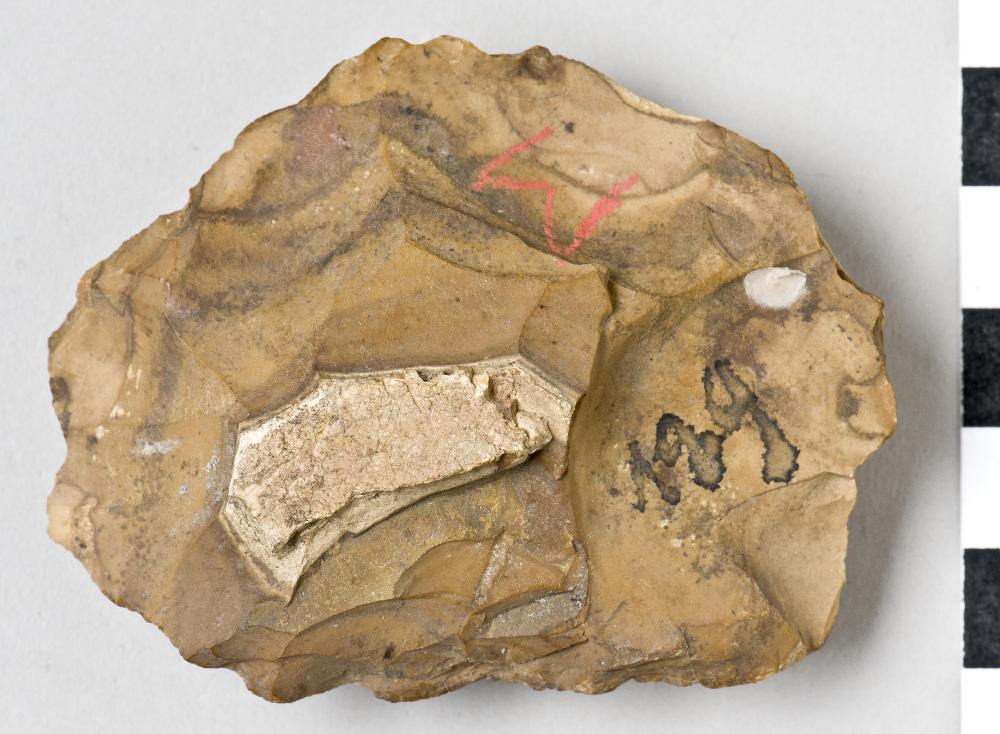 - Piece of flint, crust covering one side, the other side is not worked. Crude. Yellowish brown flint.