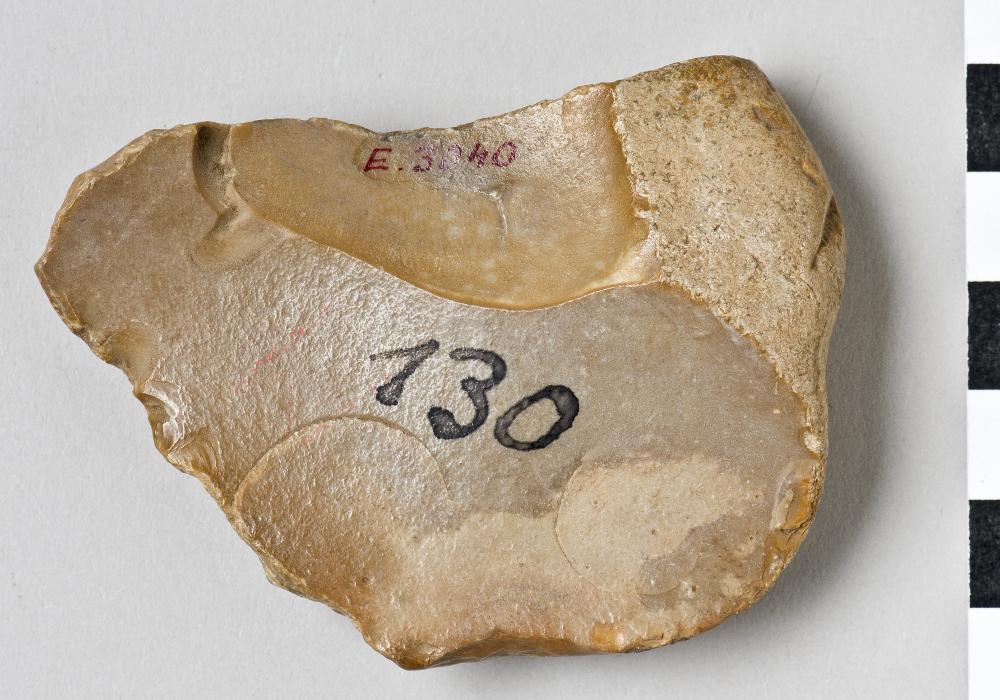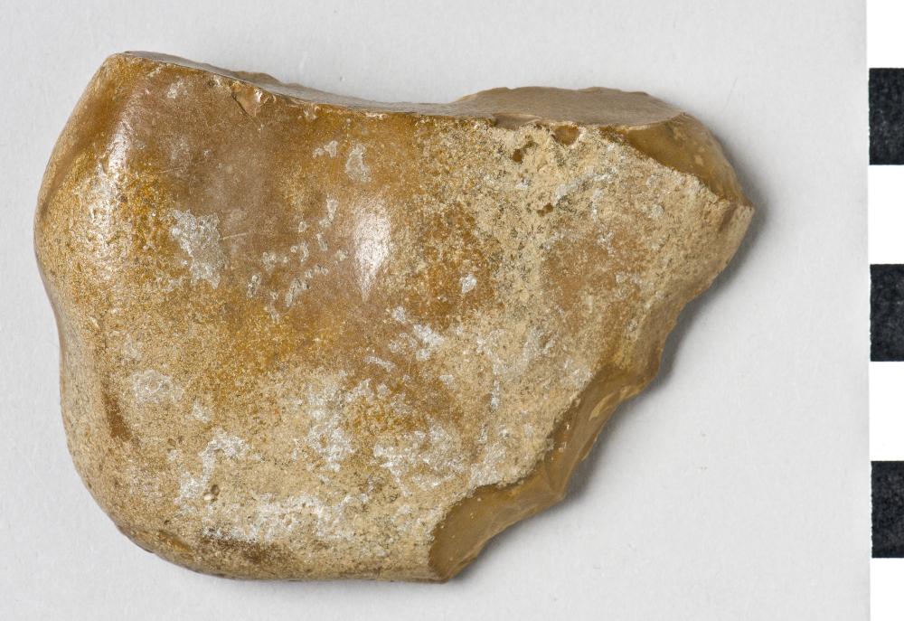 - Scraper, irregularly shaped, one side covered by crust. One worked edge. Yellowish brown flint.