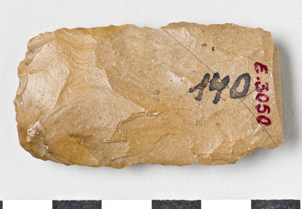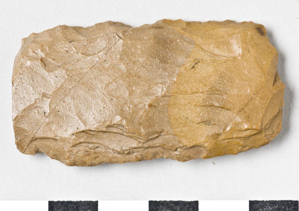 - Knife, rectangular, one half missing, worked on all sides. The edges are slightly retouched. Yellowish brown flint.
