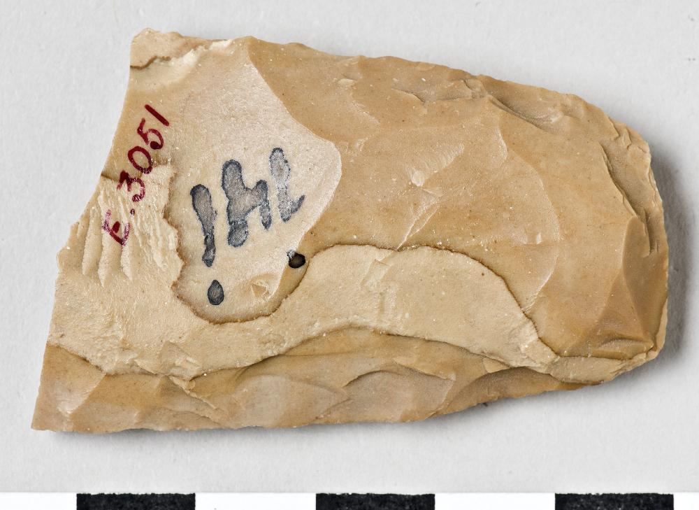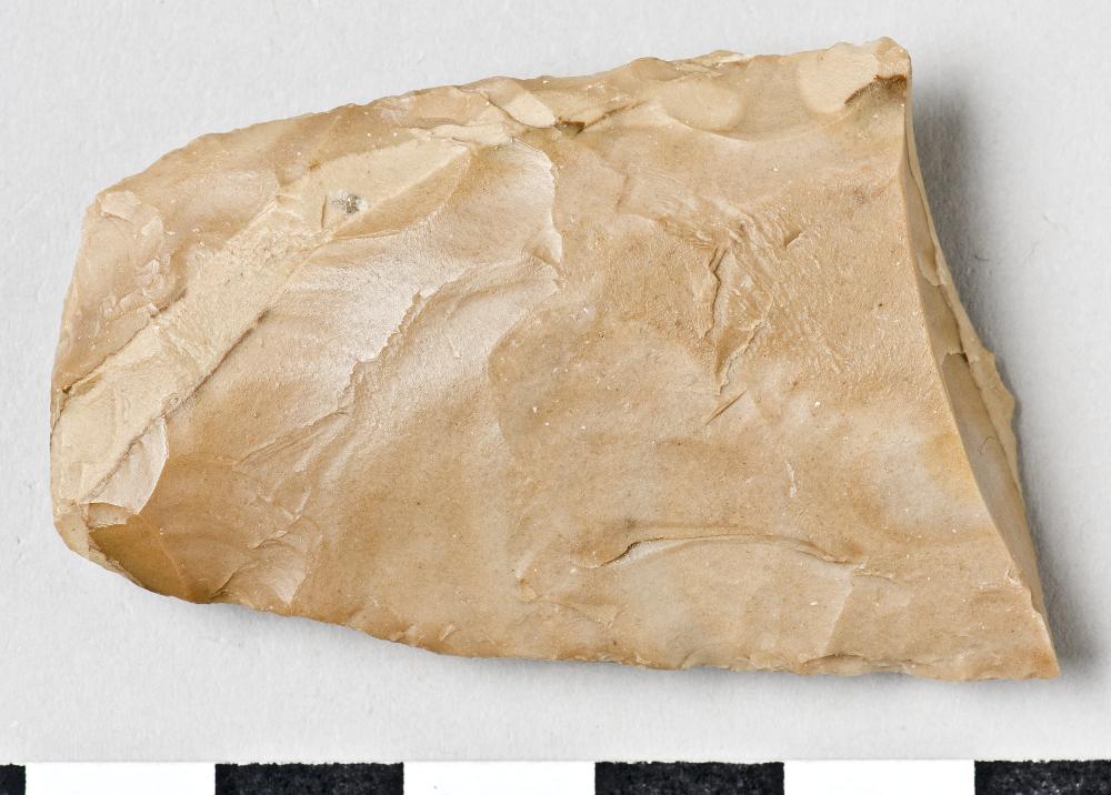 - Knife, rectangular, one half missing, worked on all sides. The edges are slightly retouched. Yellow flint.