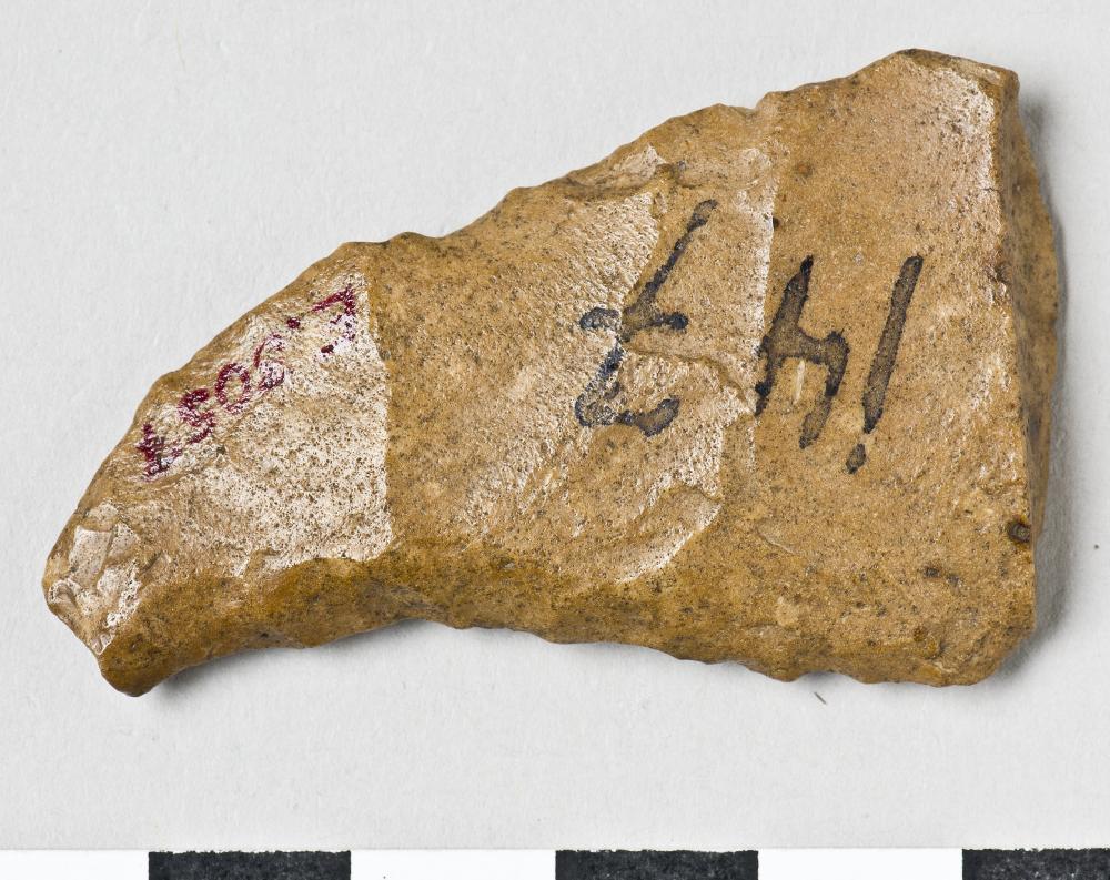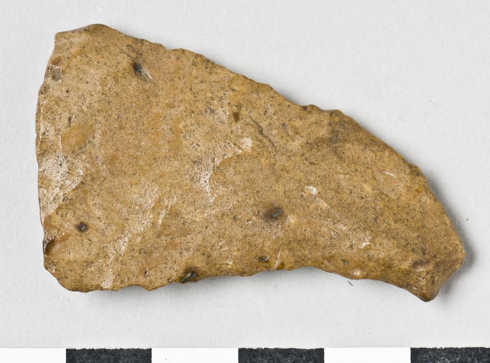 - Knife, curved, only the tip remains, worked on all sides. Slightly retouched edges, worn. Greyish brown flint.