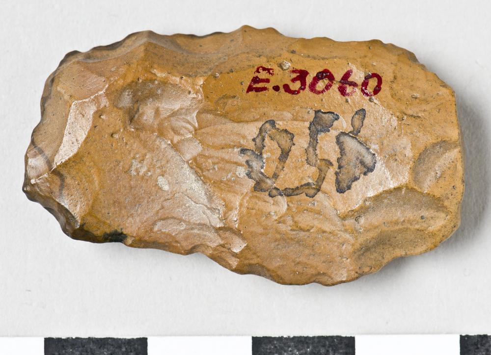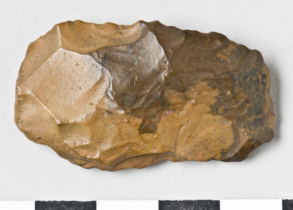 - Knife? Rectangular, one half is missing. Worked on all sides. Crudely worked. Dark brown flint.