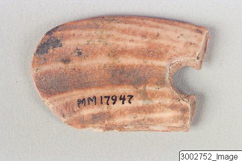 - Pendant, made of a hippopotamus´tooth. One side has the enamel preserved. One rounded end, the other is damaged, the outer part missing.