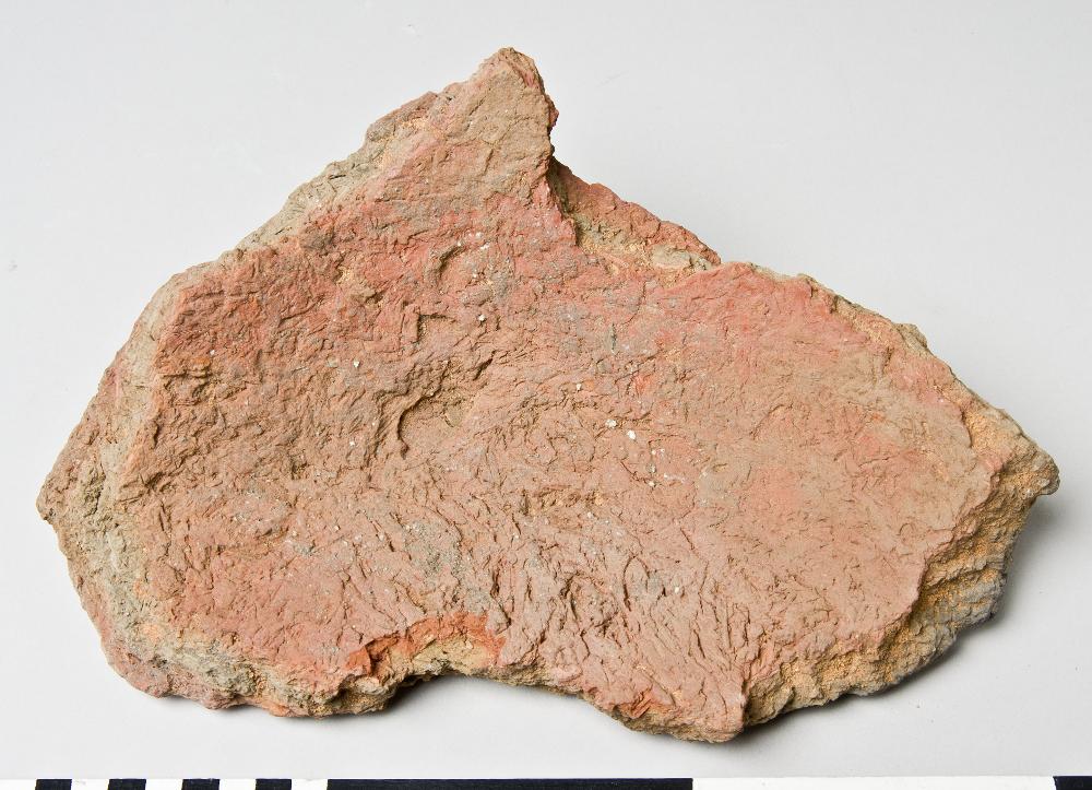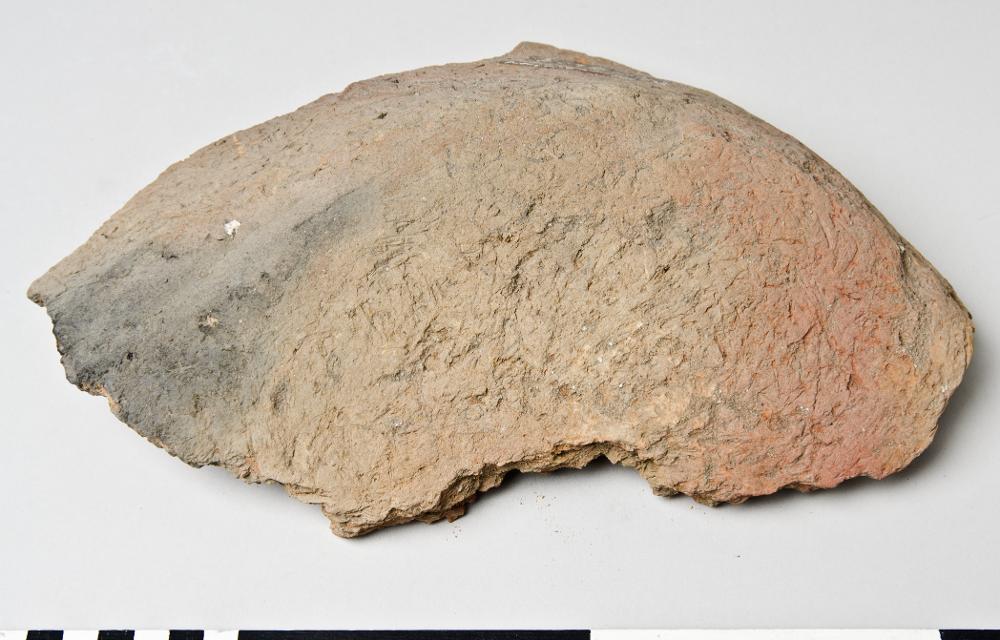 - Base sherd of a large, pot,vessel with a slightly flaring wall. Grey brown exterior, smoothed. Red interior, eroded. Brown and red core.